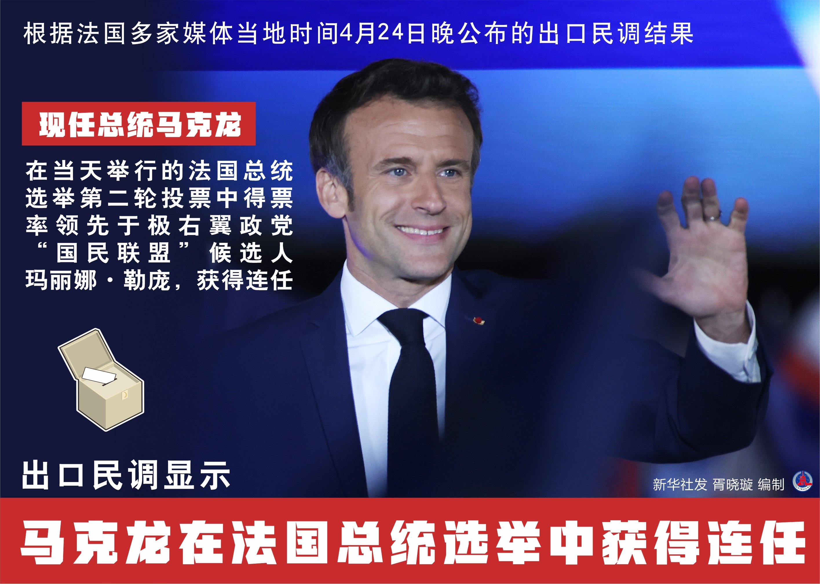 根据法国多家媒体4月24日晚公布的出口民调结果,现任总统马克龙在当天举行的法国总统选举第二轮投票中得票率领先于极右翼政党“国民联盟”候选人玛丽娜·勒庞,获得连任。