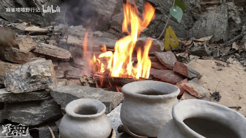 接下来就可以开始烧制了 麻雀喳喳捏了三个不同大小的罐子搭建好一个烧制的石窖 在里面放上柴火 再将陶罐轻轻的放进去 然后用之前做好的火种给柴火点燃 经过大火的烧制损坏了两个 只保留了一个完好的陶罐下来。