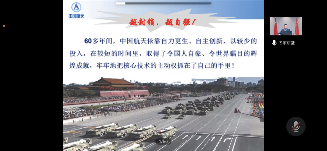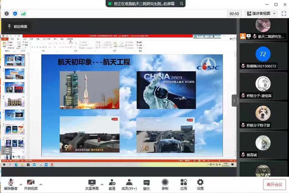4月22日-4月23日,航天科技四院院长助理庞爱民总工、航天科工二院党校党建与领导力培训处副处长林培源做客翱翔名家讲堂,分别以“精神与使命——讲述航天科技四院高能故事”和“光荣与梦想——航天精神的焠炼与传承”“航天精神的焠炼与传承”为主题做了精彩的报告。两位专家分别回忆了我国航天事业的发展历程,讲述了研制大国重器的奋斗史,呕心沥血顽强拼搏的过程和新时代青年团队的坚守与执着,加深了学生对行业企业的学习了解,坚定了同学们投身航天强国建设的信心决心。