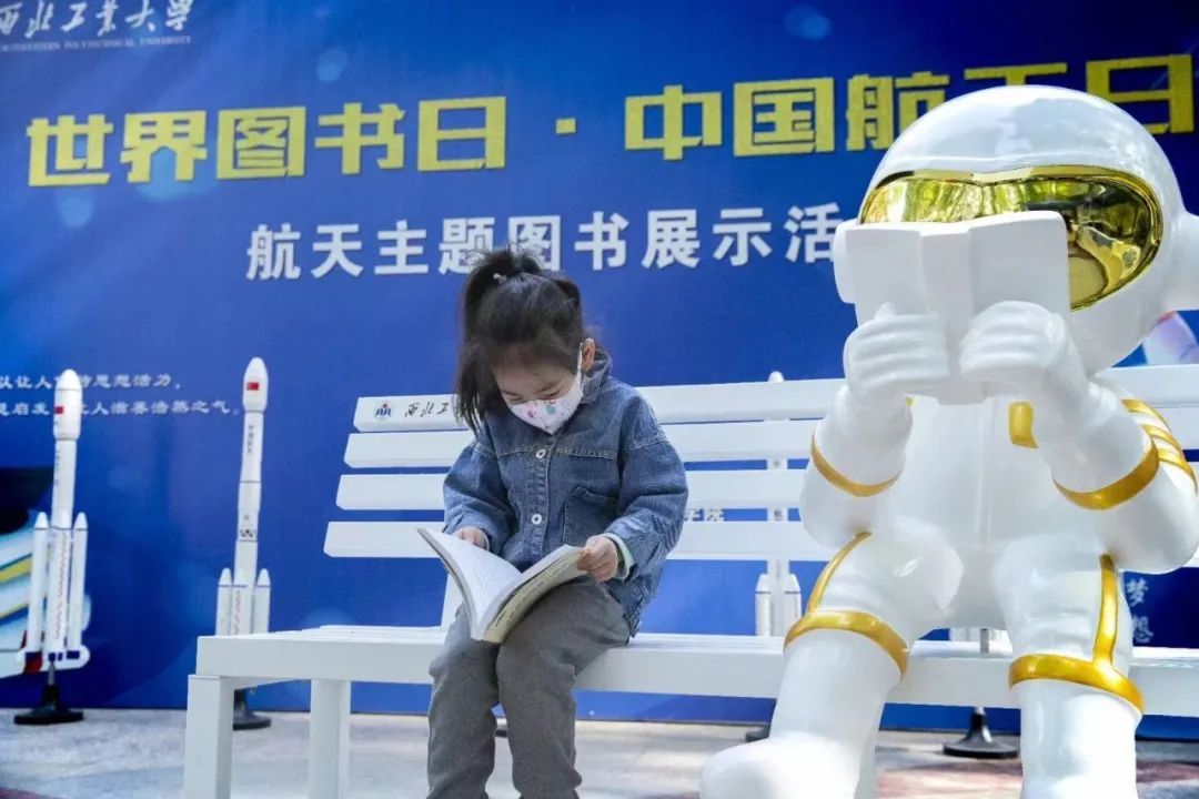 当世界读书日遇上中国航天日,学校出版社、航天学院以及西安市新华书店有限公司也在友谊校区联合组织了“航天主题图书展示”活动。