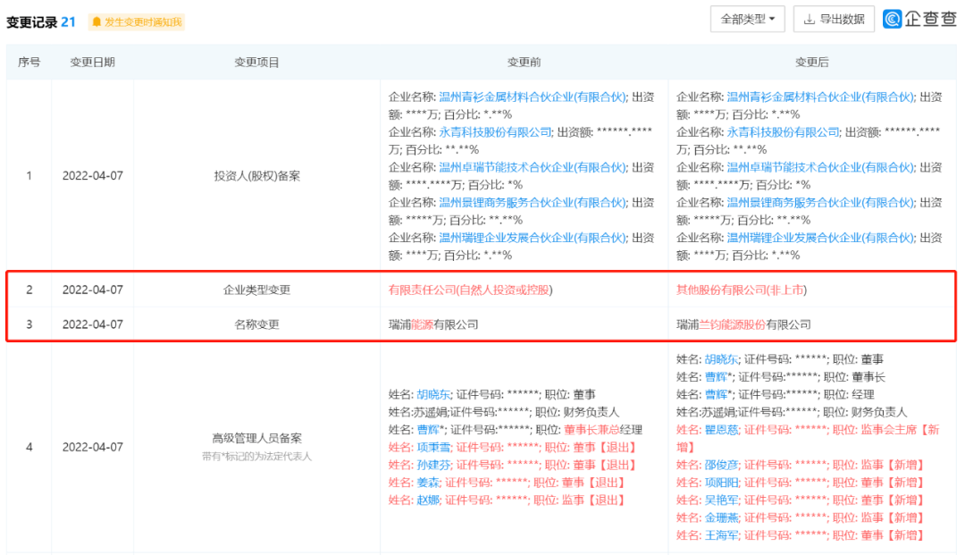值得注意的是,企查查信息显示,瑞浦能源已于4月7 日完成股份制改造和名称变更,公司全名由“瑞浦能源有限公司”变更为“瑞浦兰钧能源股份有限公司”。