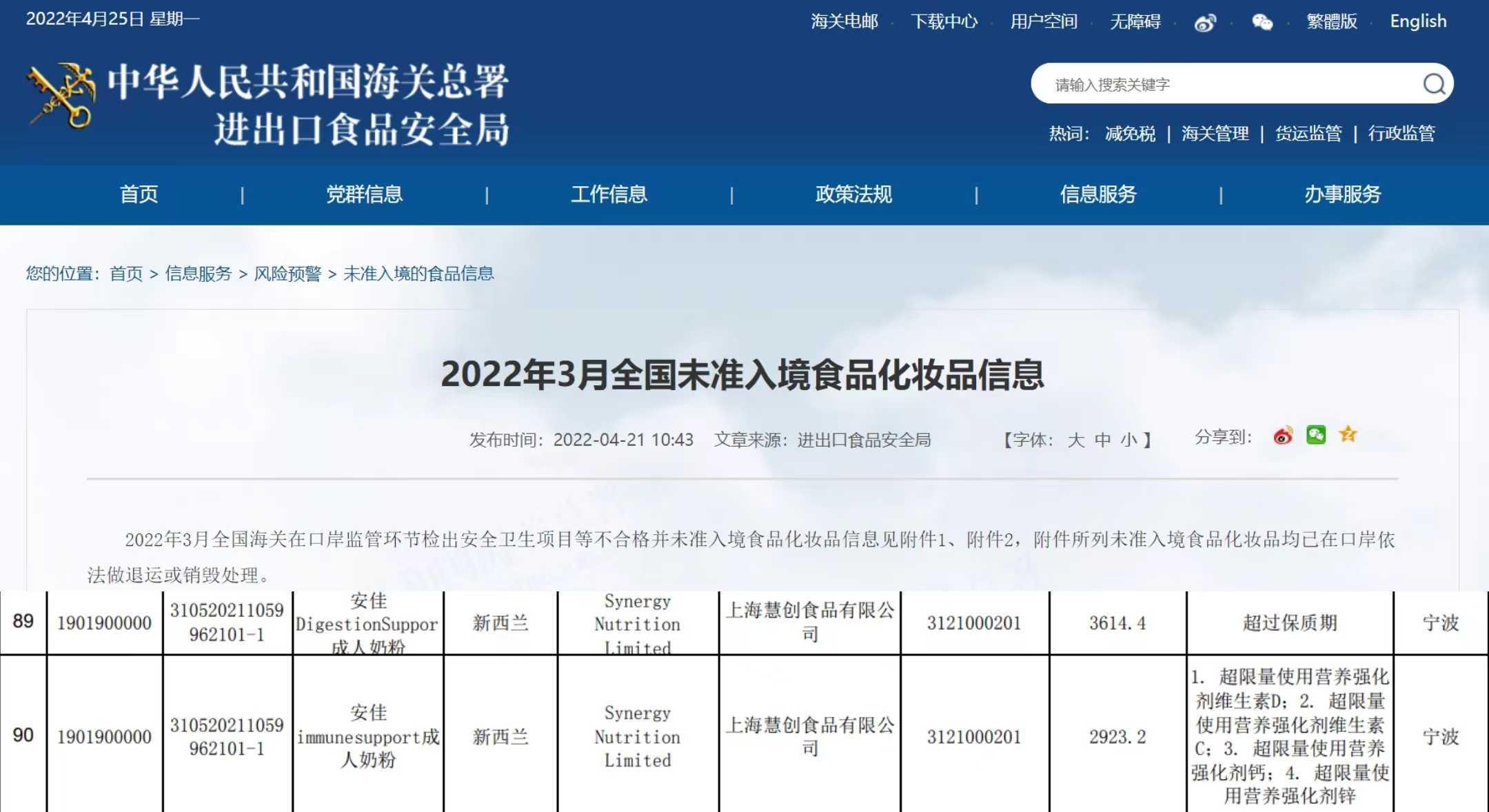 2022年4月21日,中华人民共和国海关总署进出口食品安全局发布2022年3月全国海关在口岸监管环节检出安全卫生项目等不合格并未准入境食品化妆品信息显示,由新西兰的Synergy Nutrition Limited 生产的安佳 Digestion Support 成人奶粉,一批次(重量:3614.4千克)因超过保质期未准入境,另外一批次(重量:2923.2千克)未准入境的事实是:超限量使用营养强化剂维生素D;超限量使用营养强化剂维生素C;超限量使用营养强化剂钙;超限量使用营养强化剂锌。进口商均为上海慧创食品有限公司 ,进境口岸为宁波。