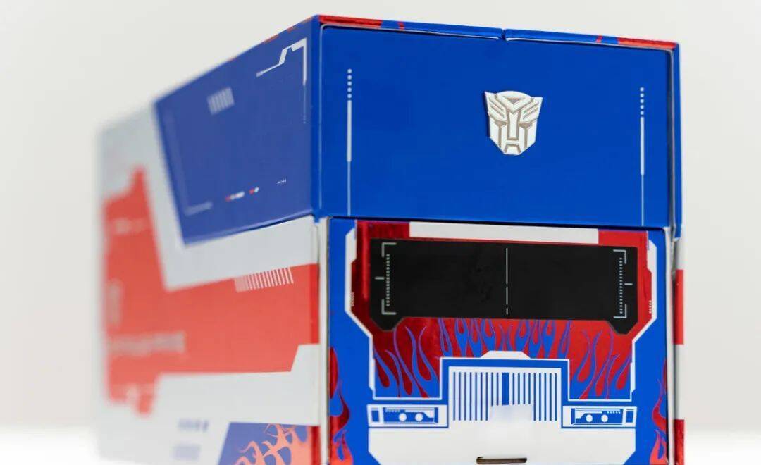 原本简单的长方体纸盒恰好与擎天柱的集装箱卡车形象对应,于是红魔干脆做了个卡车形象的包装盒,红、蓝和灰三色的经典配色,让它看起来还真有擎天柱的感觉。