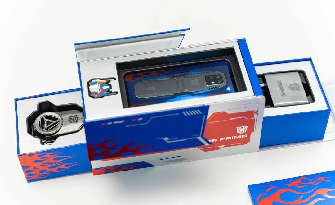 卡车的形象,也赋予了它极丰富的内部空间,红魔 7 Pro 擎天柱限量典藏版除了手机本体,还在盒子内放入了丰富的周边产品,从外到内的变形金刚元素,也展示了红魔这次在定制上的满满诚意。