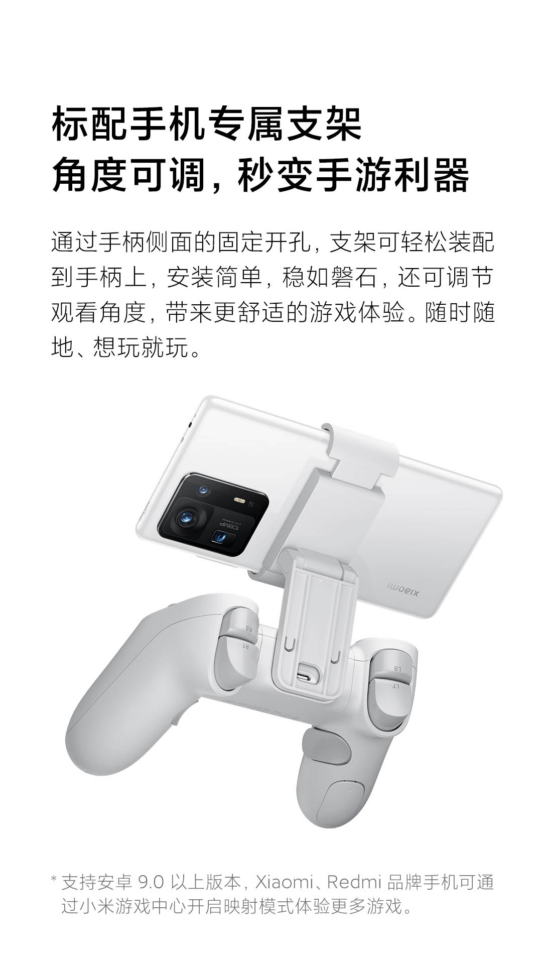 此外,它还附赠了配套使用的手机支架,可以蓝牙与手机连接。如果你使用的是小米手机或 Redmi 手机,还可以使用小米游戏中心的映射模式进行映射配对。