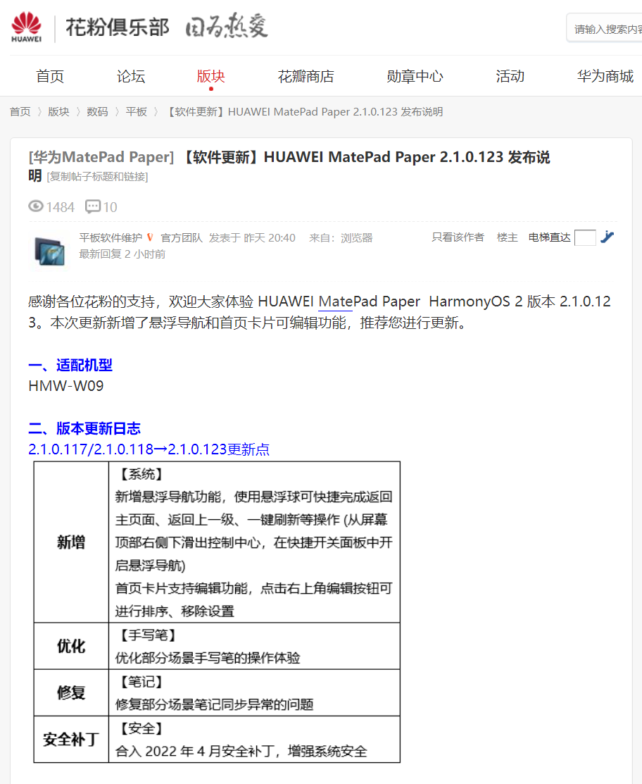 IT之家 4 月 26 日消息,据花粉俱乐部官方公告,华为 MatePad Paper 墨水平板昨日获得了 HarmonyOS 2 版本 2.1.0.123 更新,本次更新新增了悬浮导航和首页卡片可编辑功能。