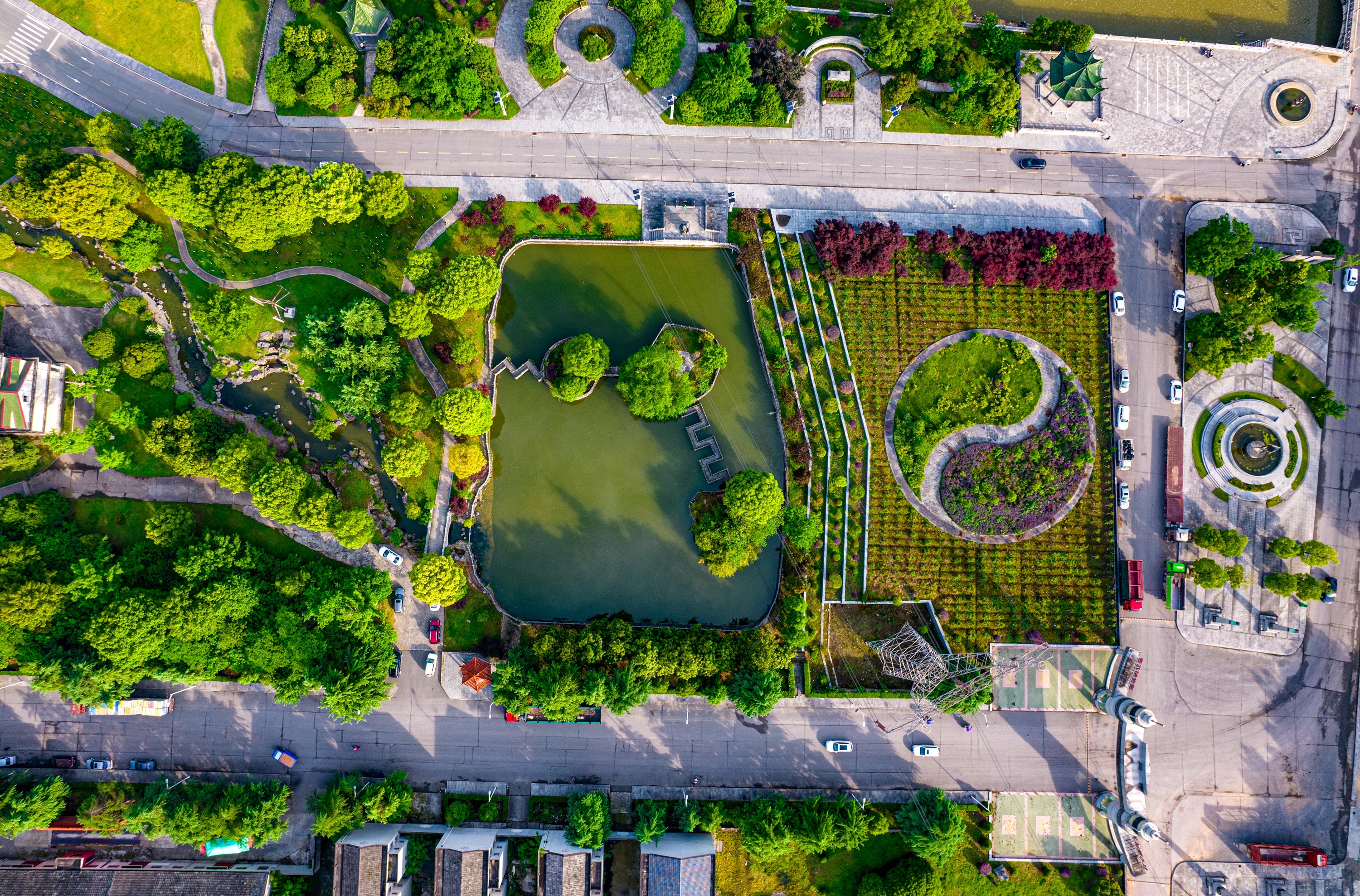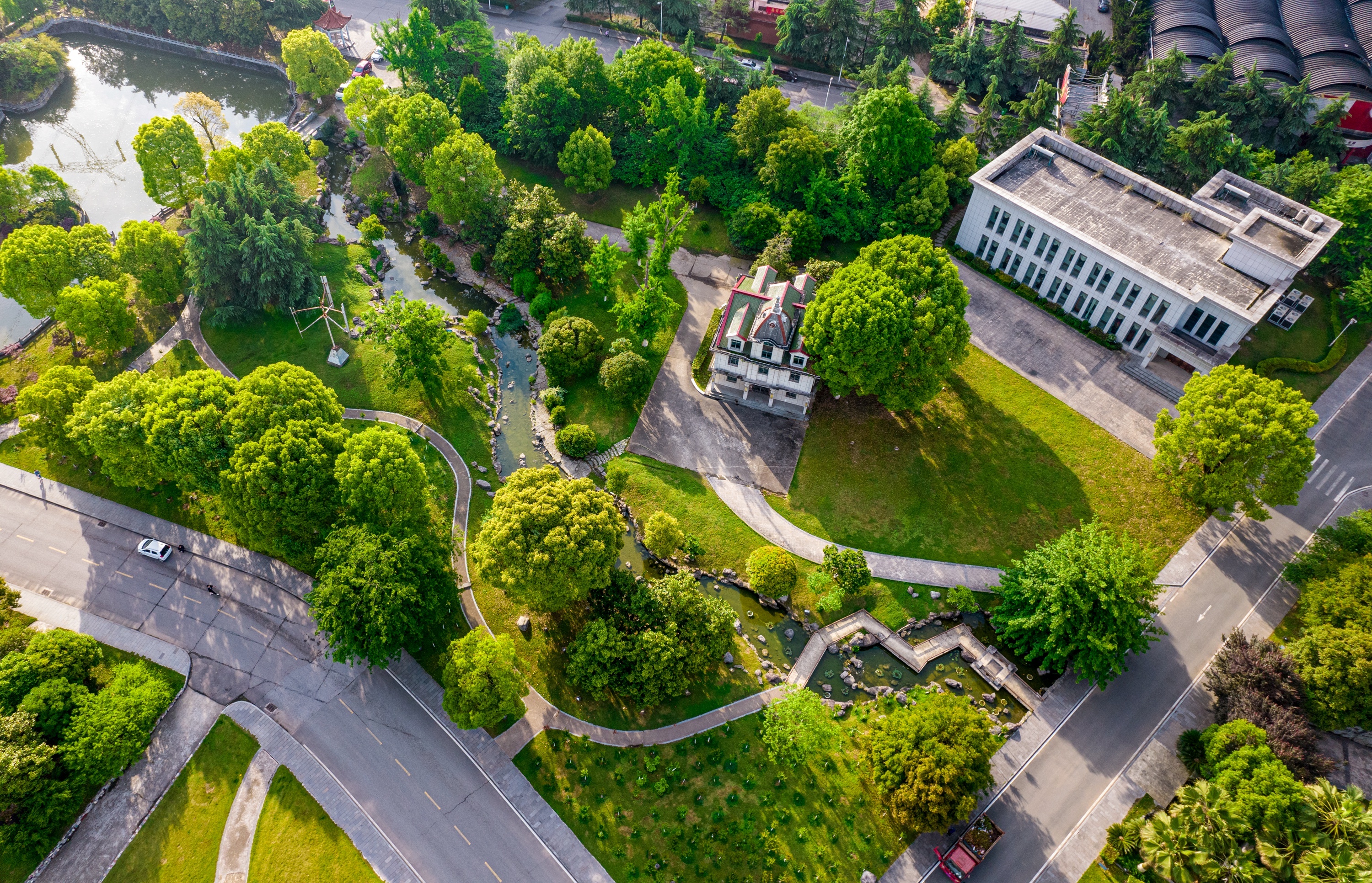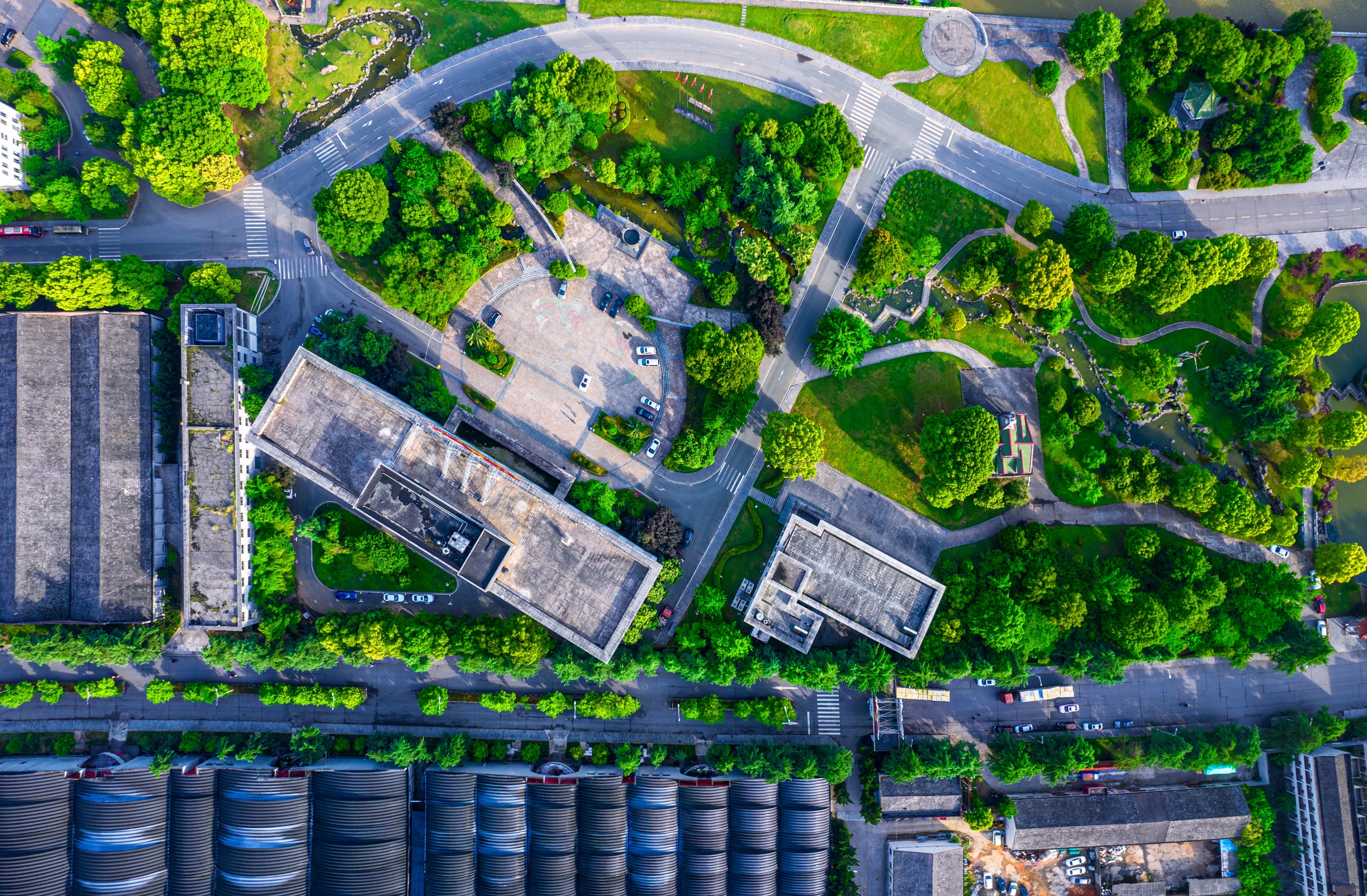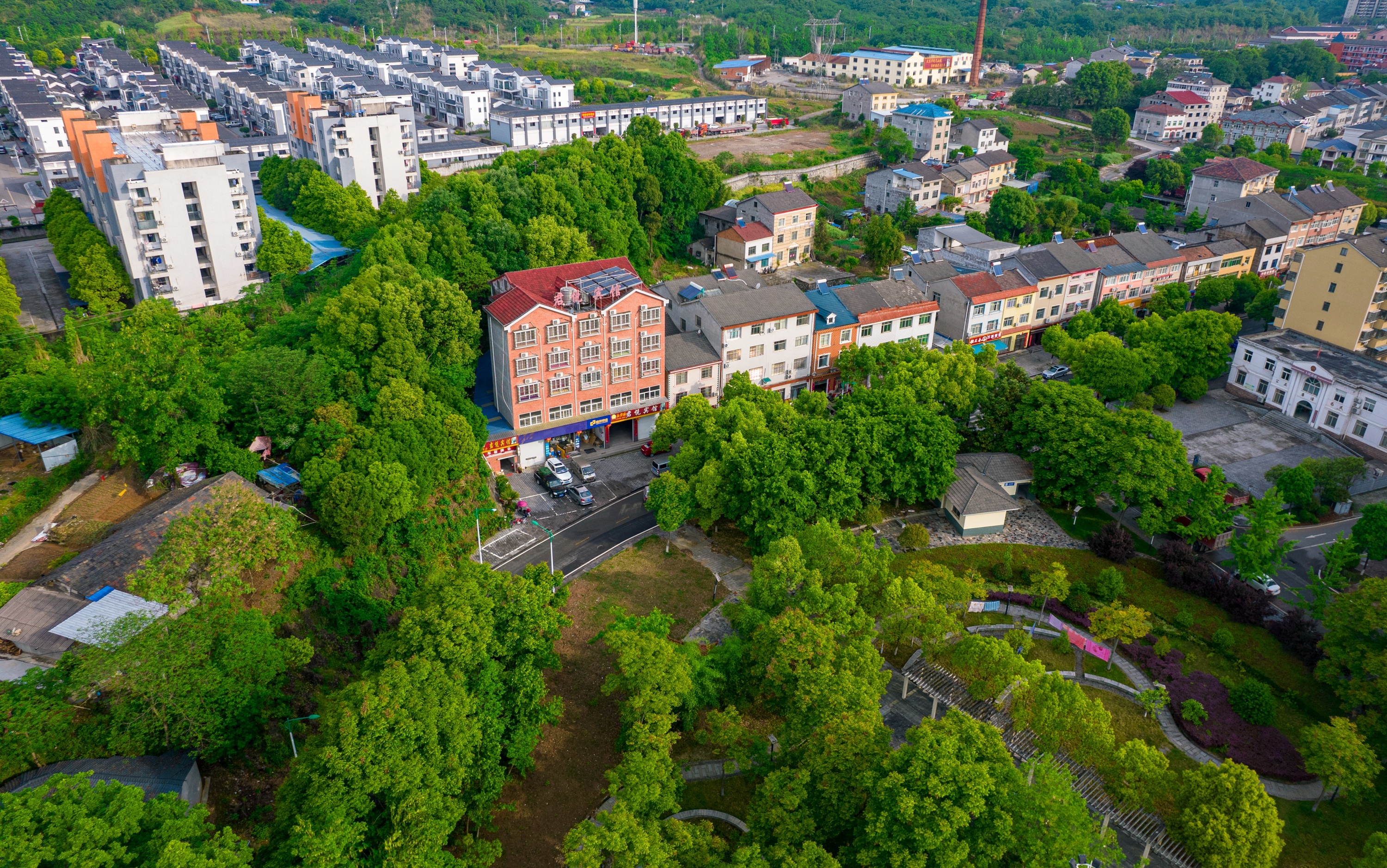 大美夷陵,航拍宜昌龙泉古镇美如诗画.4月26日天气放晴,上午七时航拍龙泉古镇酒城绿色为主色调。
