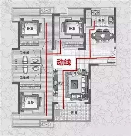 动线就是指人们活动的路线,它根据人的行为方式把一定的空间组织起来。换句话说,就是人在室内室外的移动点,联合起来就成为了动线。动线设计一般由两部分构成,一是固定物件的摆设,二是人流、物流的路径。户型动线一般分为三类:家人动线、家务动线和访客动线。三种动线在涉及区域和设计要点方面都有所不同。