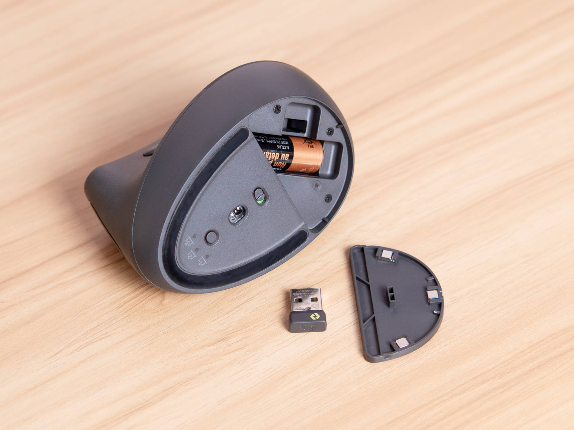 罗技Lift的电池仓设计得很巧妙,隐藏式的仓盖设计在底面尾部,通过磁吸吸附在机身上,看起来与底面融为一体。打开电池仓,就能看到罗技Lift的全部配件:一节供电的5号电池和插在电池边上的USB接收器。由于低功耗蓝牙模式的加持,罗技Lift仅需要一节电池就能提供长达两年的续航。