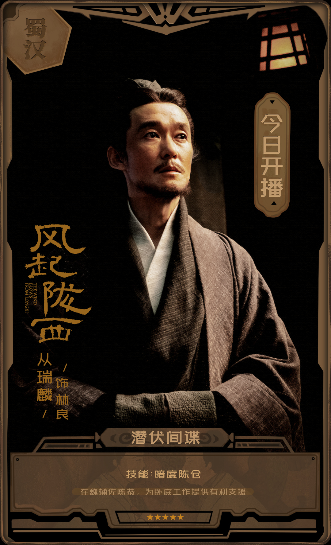 今晚,由路阳执导,改编自马伯庸同名小说,陈坤、白宇领衔主演,杨轶、从瑞麟、侯玮涛、彭义程、朱超艺主演的《风起陇西》即将在央视八套电视剧频道、爱奇艺播出。从瑞麟在剧中饰演潜伏间谍林良,与陈恭一明一暗,获取曹魏情报信息。