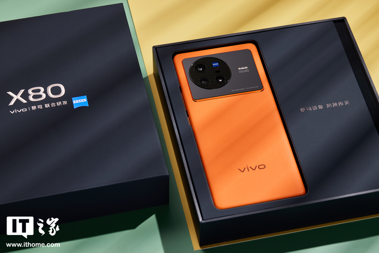 包装盒方面,vivo X80 仍然是传统的扁正方体设计,表面为黑色皮革质感,“X80 vivo 蔡司联合研发”的烫印文字颇为醒目,还有 ZEIZZ 的小蓝标也在告诉大家这是一款影像旗舰。