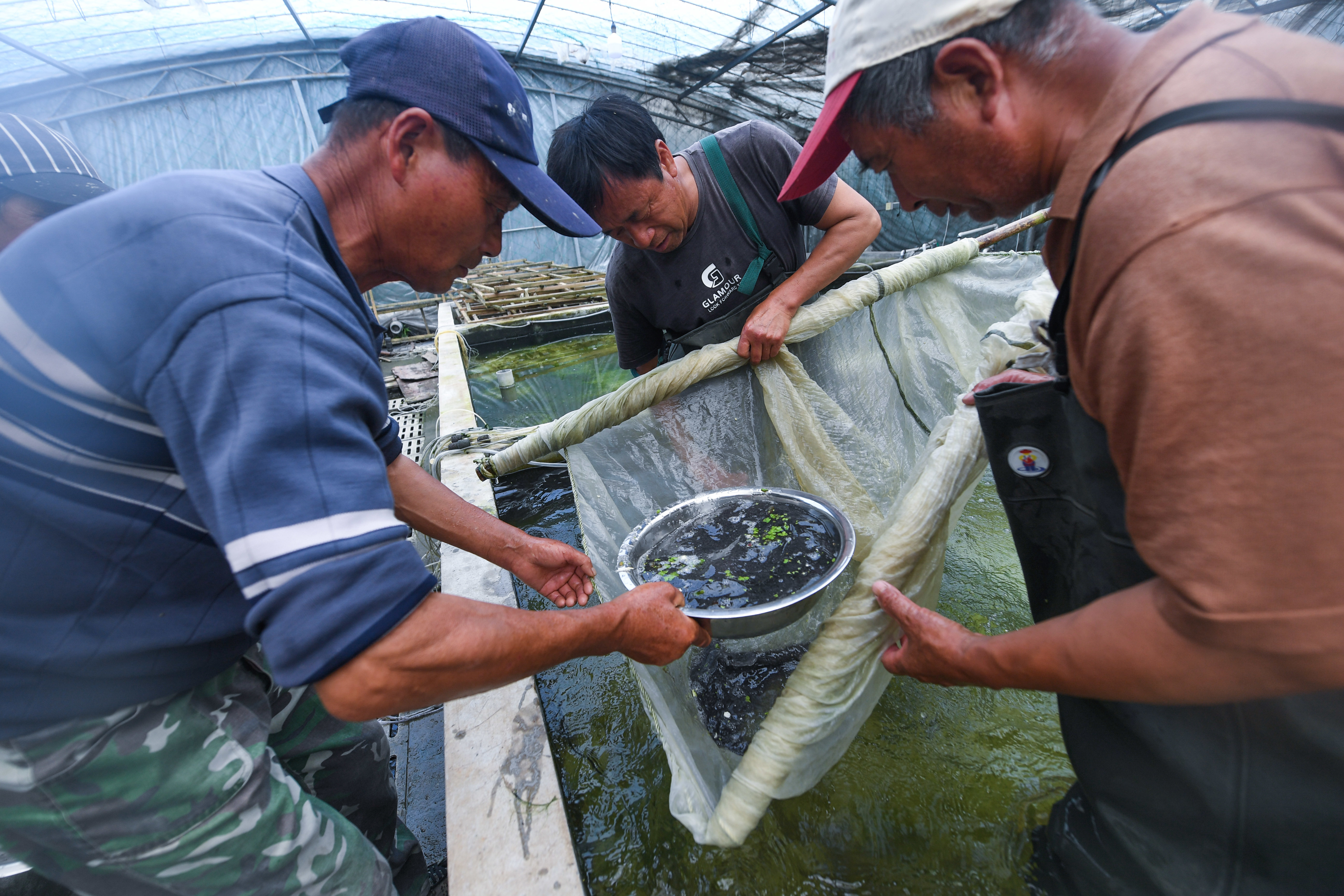 4月27日,在湖州市吴兴区东林镇保健村湖旺水产基地,工作人员从育苗池内打捞鱼苗。 据悉,该水产基地规模达200亩,目前每日能孵化1000多万尾鱼苗,日销售额8万余元。
