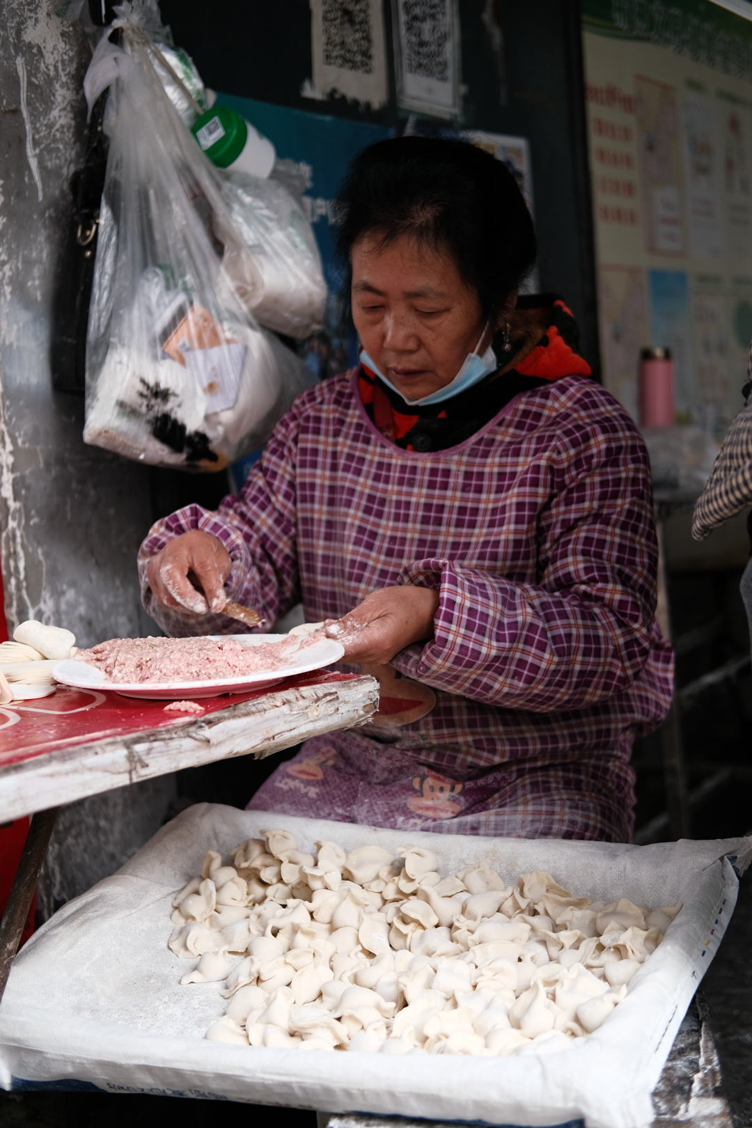 张姐抄手饺子全凭经验,80年代没人教,她看着别人怎么包自己就怎么做,每天早上八点,张姐把桌椅摆在家属院门口,坐在铁门边大伞下,叼上烟,一颗一颗包到十二点,中午卖完结束。