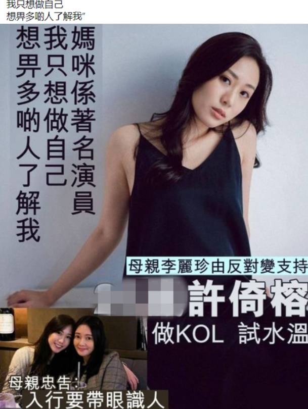 早前据台媒报道,原本毕业于名牌大学的许倚榕一直专注着服装设计领域,最近却突然宣布将朝着网红进军发展,而许倚榕本人也透露此举是因为想让更多的人了解自己,想撕掉外界对其“李丽珍女儿”的这个刻板印象。对于自己的事业转型新动态,许倚榕表示母亲李丽珍也由一开始的反对,到如今的支持态度,同时还给出了入行要带眼睛识人的忠告。