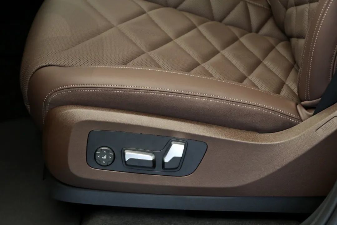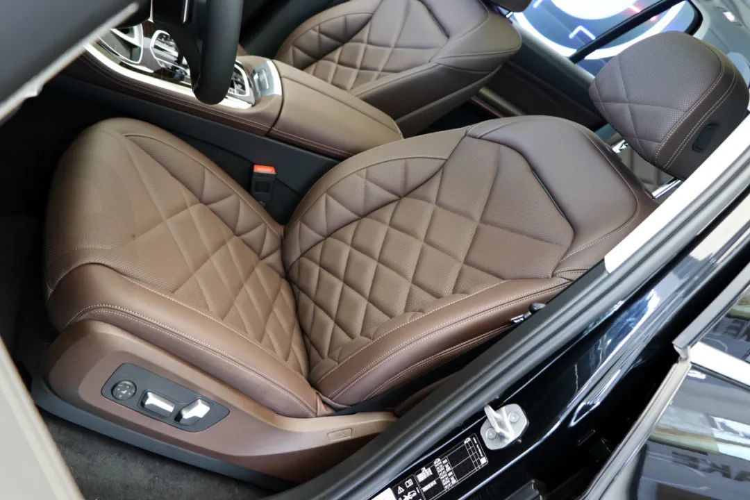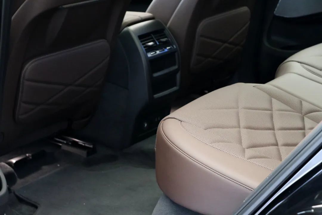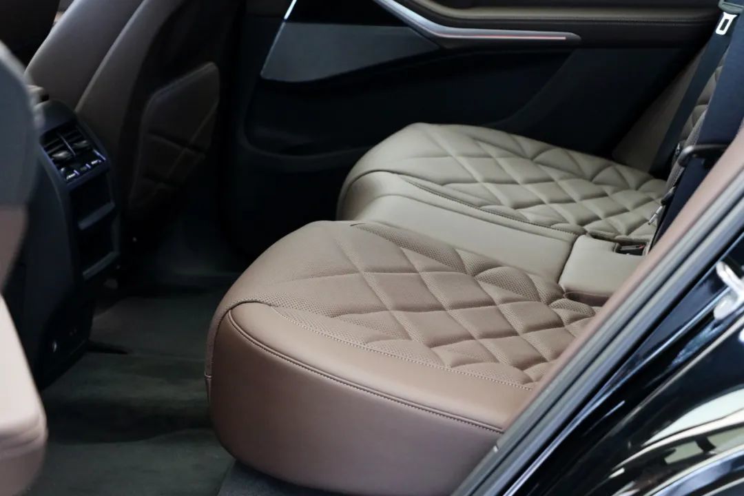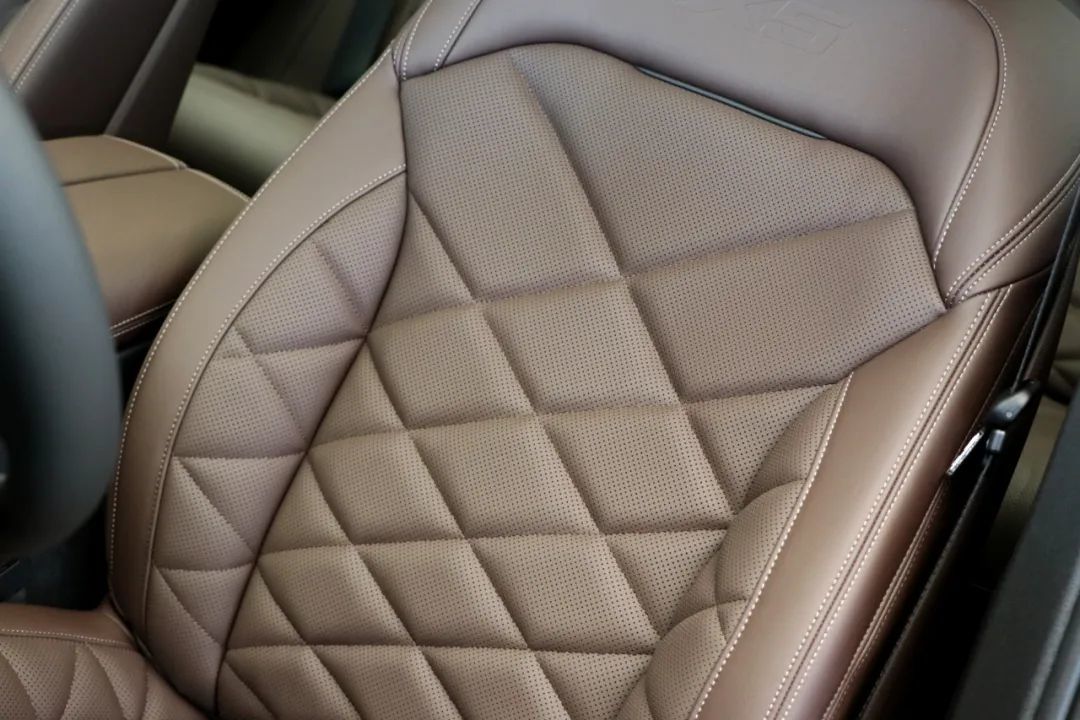进口版X5为了运动化的取向,座椅设计相比同级是稍微硬一些的,国产之后全系配备了Sensafin高级软质合成皮,虽然不能选真皮,但是这个打孔的皮质真的特别软和细腻,座椅靠背和坐垫都增厚15毫米之后真是有直接的陷入感。
