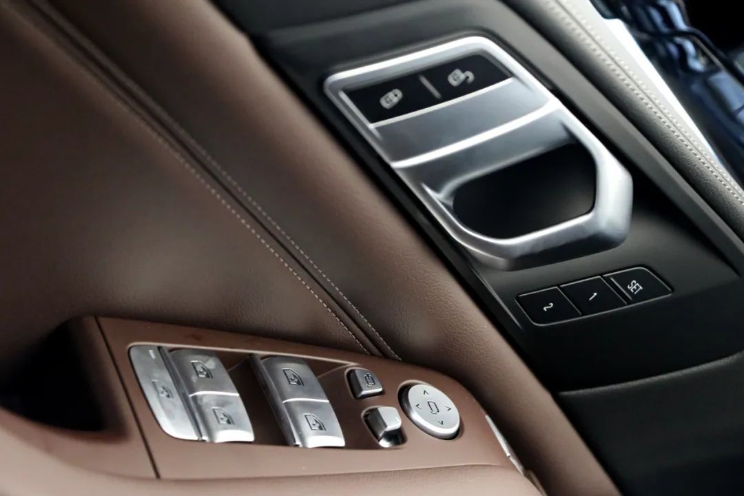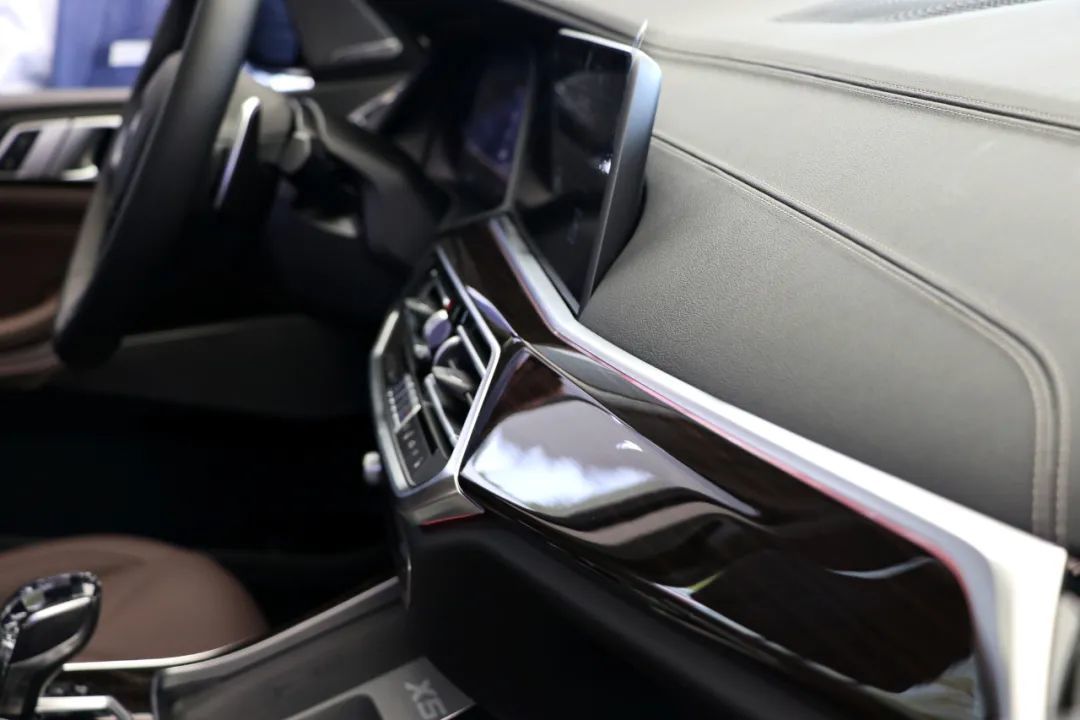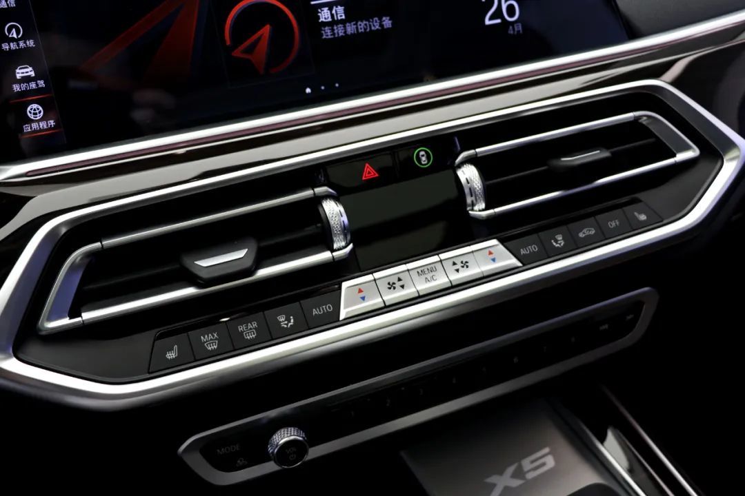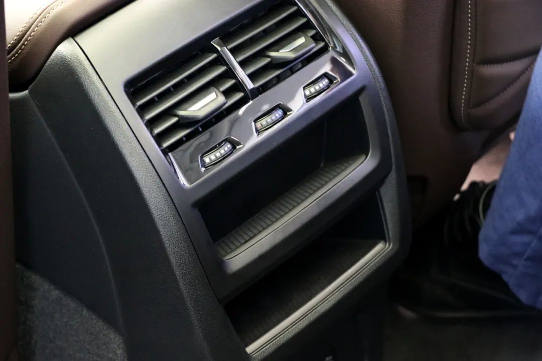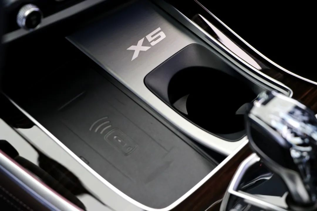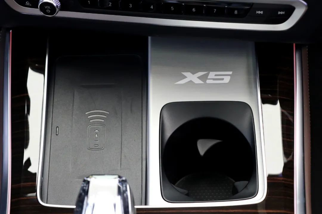 内饰部分还是大体延续了之前的设计语言,兼顾了豪华感与实用性。另一处改变就是中控区域取消了原有的盖板,左边是无线充电,右侧是单个杯架,杯架上方填了一块X5的logo,增加了辨识度。