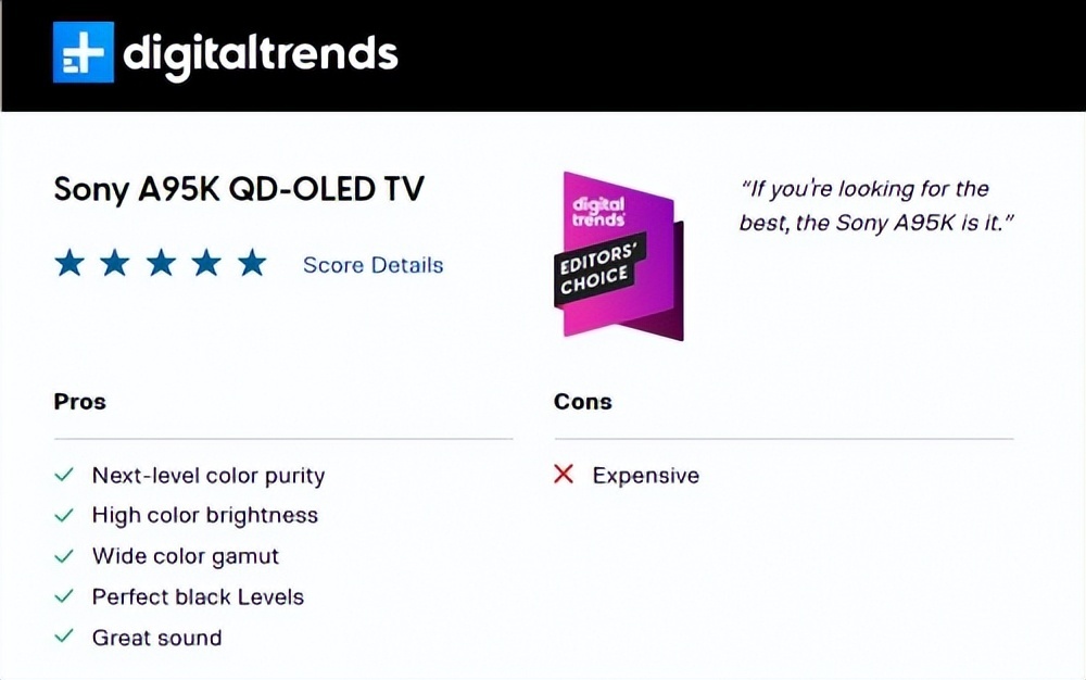不仅如此,近日,《Digital Trends》、《CNET》、《Trusted Reviews》、《techradar》、《What Hi-Fi》等多家权威数码媒体也发布了A95K的产品评测与上手内容,并对A95K给出了极高评价。以《Digital Trends》为例,其评测报道来看,不仅标题中称A95K为“OLED的一次量子飞跃”(A quantum leap for OLED),更在评测中表示索尼在色彩表现、色彩亮度、黑位表现以及声场表现等方面都有着很强的实力,并为索尼打出了5星满分!