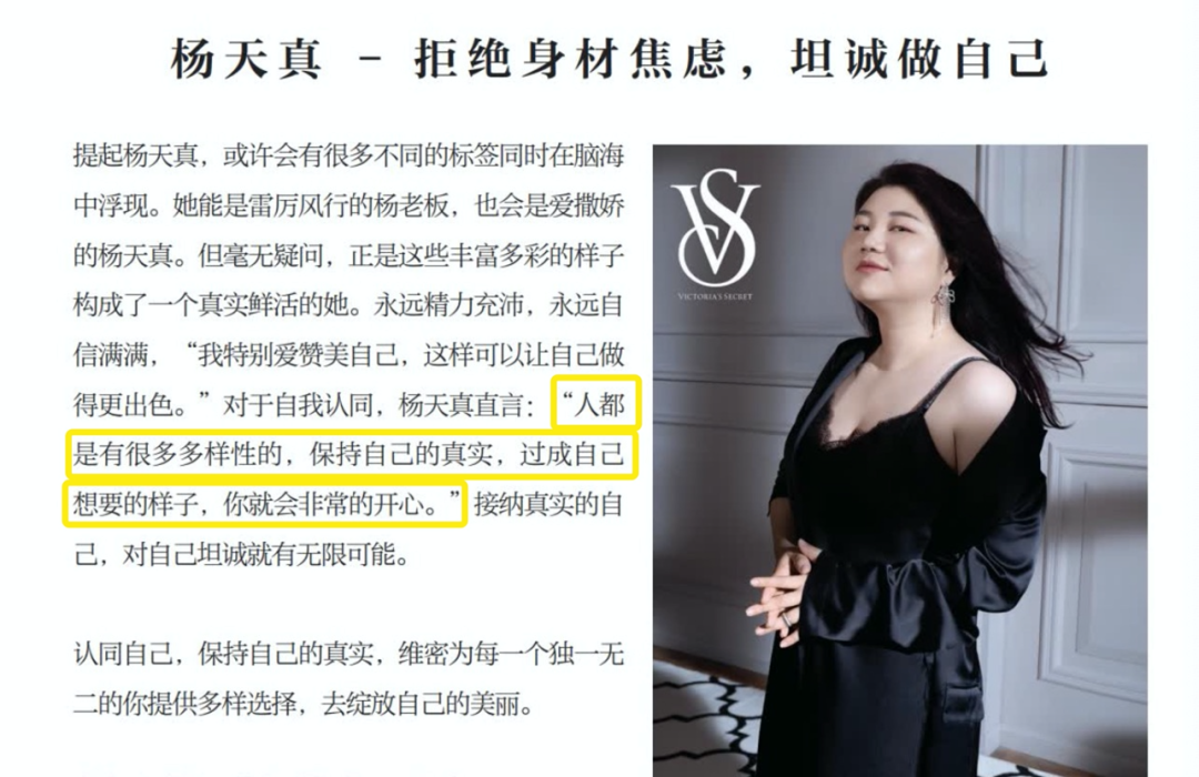 就像当“白幼瘦”逐渐成为主流审美趋势时,维密挚友杨天真却说:”人都是有很多多样性的,保持自己的真实,过成自己想要的样子,你就会非常的开心。”