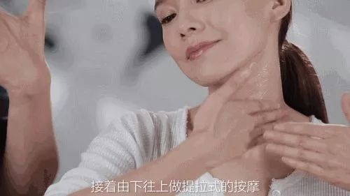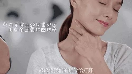 五、最关键的就是颈霜用量绝对不能省!尽可能厚涂,并由下而上的螺旋按摩,不仅能拉提颈部肌肤,也促进颈霜更好地吸收、淡化纹路。建议左右两边按摩约15秒。