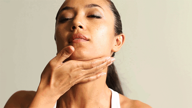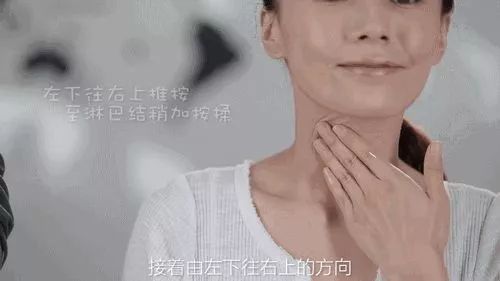 先从左右两侧由上而下往锁骨的方向按约15秒,促进淋巴代谢。有双下巴的宝贝儿也可以手握拳头利用手指关节按摩,将双下巴的肉肉分别往耳朵的方向做提拉。