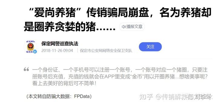 近年来,互联网养殖项目骗局屡见不鲜,早在2018年11月26日保定网警巡查执法发布了转载自防骗大数据标题为《“爱尚养猪”传销骗局崩盘,名为养猪却是圈养贪婪的猪……》的文章,文中称:通过“爱尚养猪”软件网上养猪,养一头小猪500元,一个月利润80元;中猪1500元,两个月利润550元;母猪4500元,三个月利润2610元。如此高的利润,吸引了大批的贪婪者加入。只可惜,这个传销诈骗平台还是崩了。