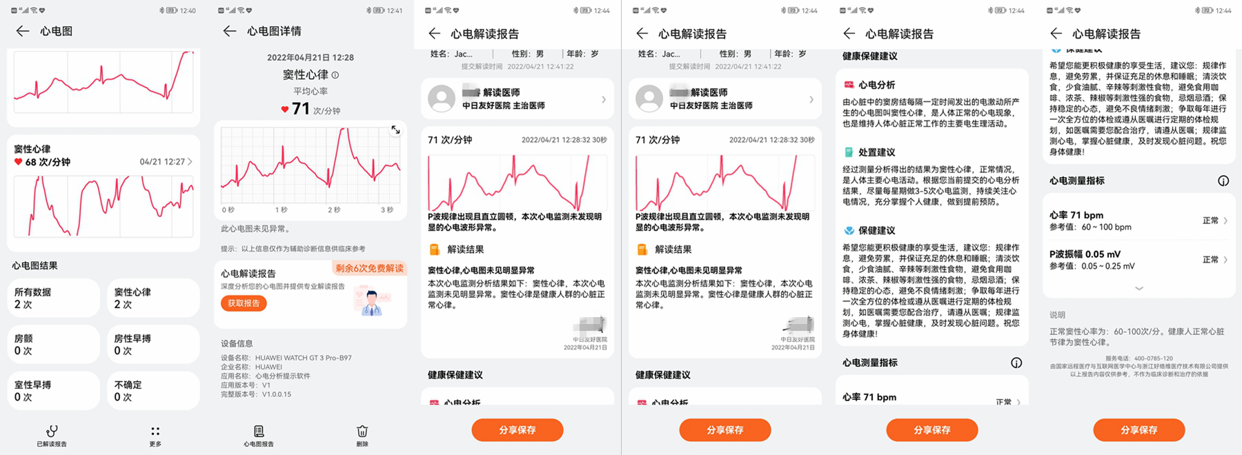 ECG功能各位应该都不陌生,在华为可穿戴设备上首发于WATCH GT2 Pro ECG版,按照手表提示触碰电极,经过几十秒的测量,就可以得到一份心电图的数据。在运动健康APP中,还可以申请获取自己心电图的解读报告,在等待一段时间之后,就会收到。里面会给出比较详细的解释以及防护建议,非常实用。