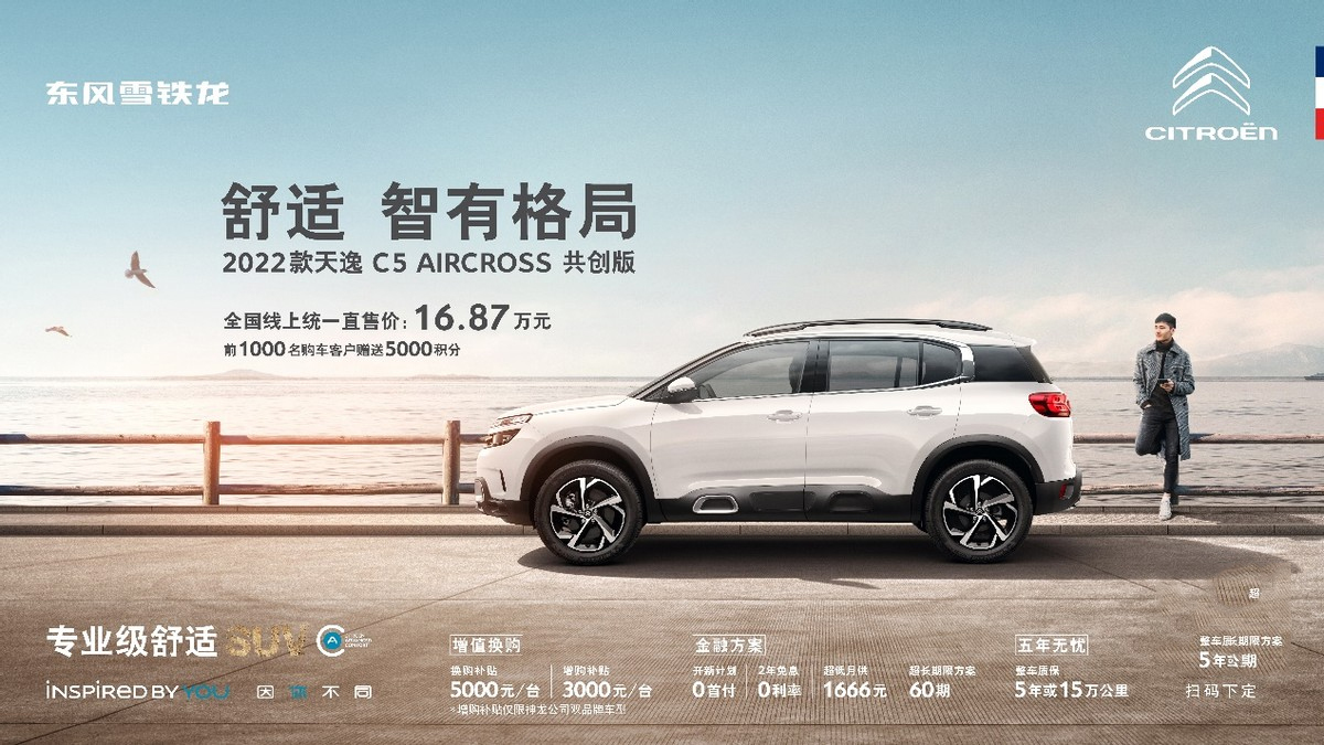目前东风雪铁龙已经同步在全国各地授权网点多次开展“驾享春色 遇见凡尔赛——凡尔赛C5 X全国非凡体验季”活动。同时,现在购买凡尔赛C5 X,还可享受:首付999元,包税包牌包保险,月付3333元,“五星安全”座驾凡尔赛C5 X轻松开回家活动。想深度体验凡尔赛C5 X舒适魅力的朋友,快快扫码下方二维码报名吧!