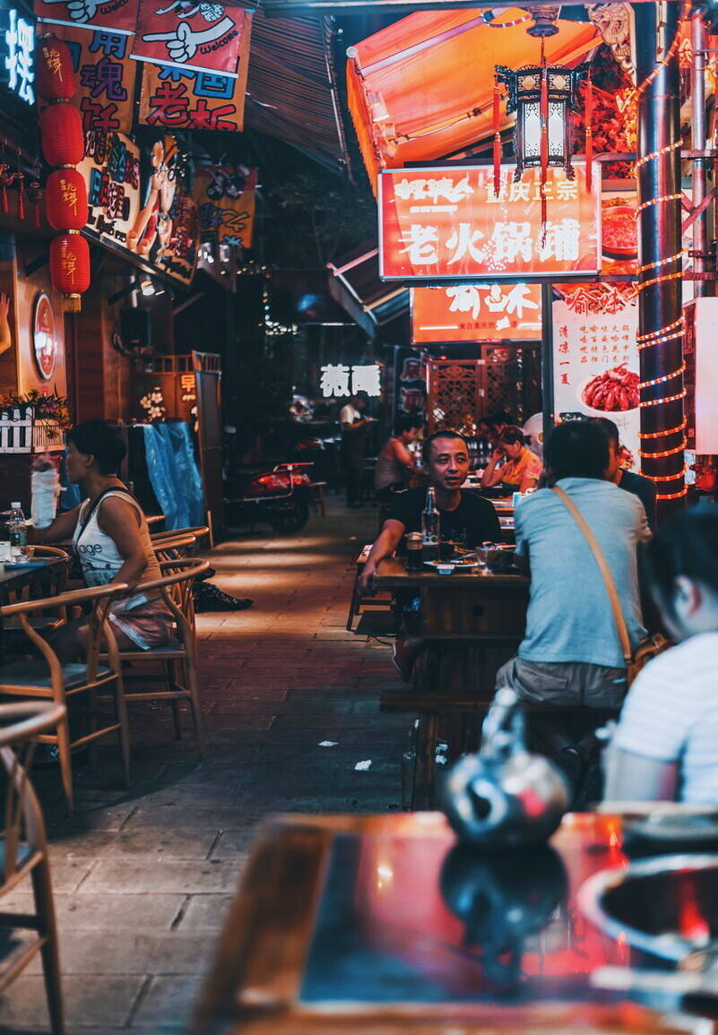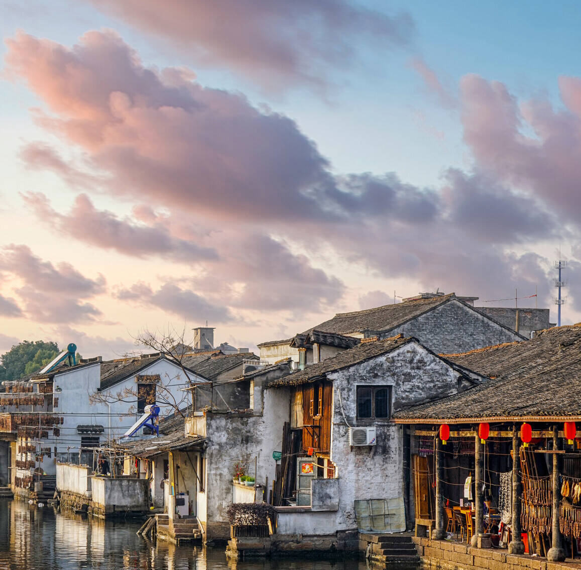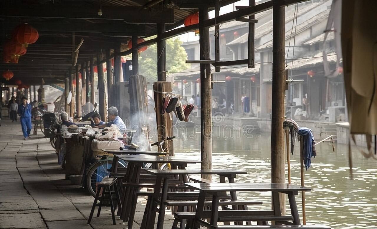 傍晚的暖光爬上临水的屋脊,打在潺潺流水边,也映在人的面颊与酒碗里。