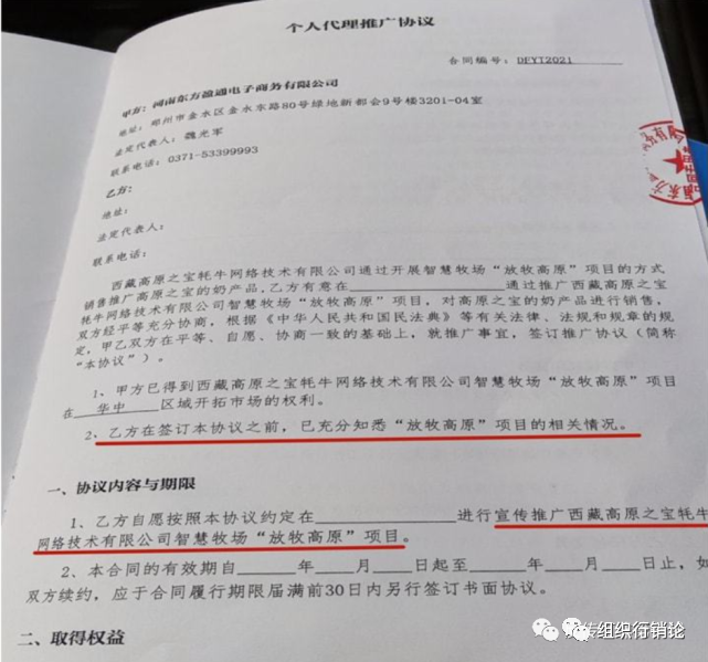 我们不妨来看看这份《个人代理推广协议》,签订双方分别是河南东方盈通电子商务有限公司和代理商,协议中明确规定:“乙方在签订本协议之前,已知悉“放牧高原”项目的相关情况。乙方自愿按照本协议约定在XX(某地)进行宣传推广西藏高原之宝牦牛网络技术有公司智慧牧场‘放牧高原’项目。乙方推广购货的预付金额单次需要在10万元以上,取得个人代理资格。”