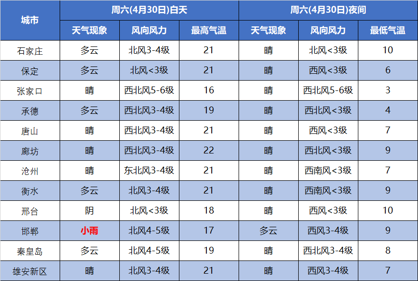 30日夜间到5月1日,张家口、承德、唐山、秦皇岛晴转多云,其他地区晴间多云。大部分地区有偏北风4到6级,阵风7到8级。
