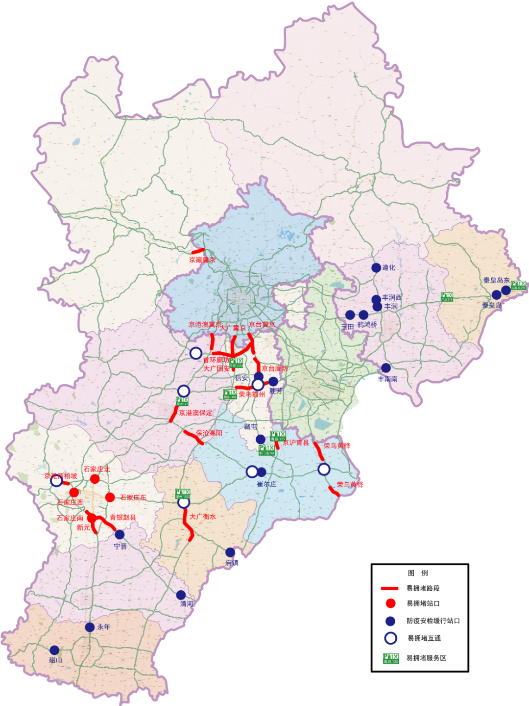 高速公路缓行路段和站口预判:京港澳、大广、京台、京藏冀京界,京港澳保定段、首都环线、大广固安段和衡水段、保沧高阳段、荣乌霸州段和黄骅段、京台廊坊段、京沪青县段、新元、京昆西柏坡、青银赵县段,石家庄4个端口站。