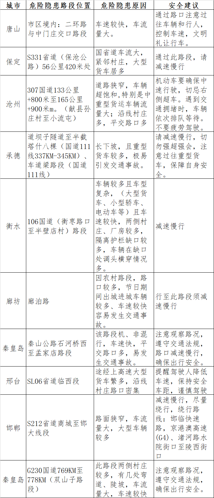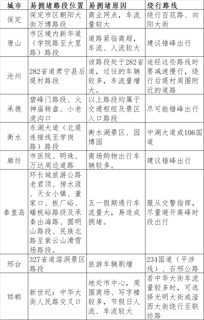 在国省道方面,预计出现大流量的路段为:242省道石家庄高邑至邢台临城段、唐山205国道滦河大桥段、唐山丰南509国道沙河大桥段、邢台邢临线与定魏线交叉口、承德市滦平县国道112线西地至大屯段、衡水武邑106国道与宁武路交叉口、廊坊霸州霸杨线杨芬港镇辖区段。