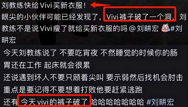 发现了王婉霏裤子破洞的网友们纷纷在评论区留言喊话刘畊宏,让他快给老婆买新衣服,每天的运动强度都这么大,裤子被磨破了也属于正常情况,只是在直播间穿着破洞裤跳操的艺人,似乎这还是第一个。