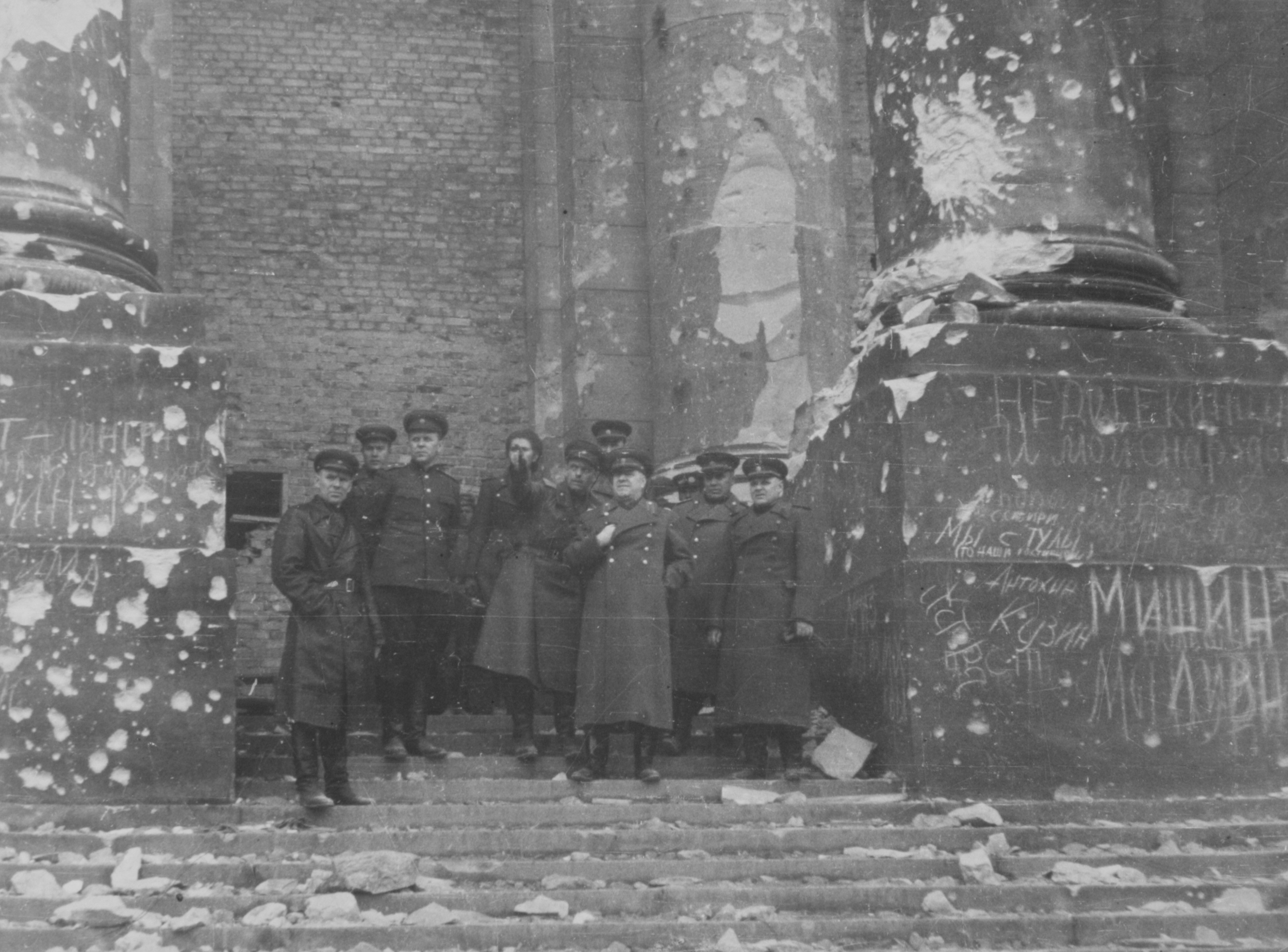 1945年5月3日白俄罗斯第1方面军司令朱可夫与方面军军事委员会委员捷列金 (,右一)等登上国会大厦