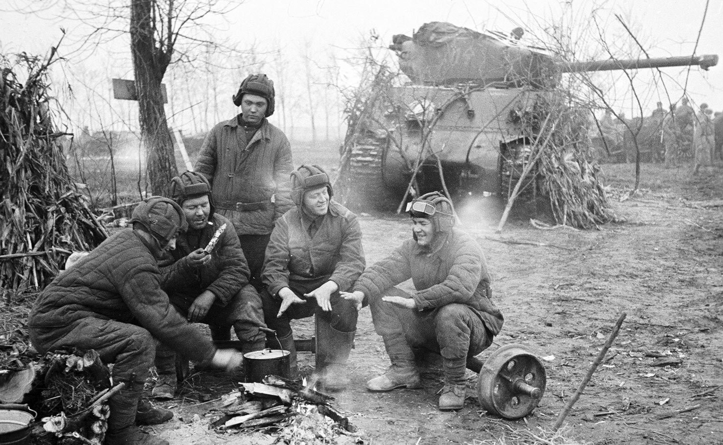 1944年9月波罗的海沿岸第1方面军士兵在伪装的М4 谢尔曼坦克旁烤火休息
