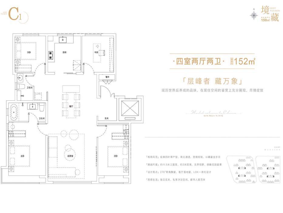 此次加推的152㎡四室两厅两卫户型格局方正、南北通透,九窗全明,是经典的四叶草户型,南向总面宽达到11.5米,并设置了独立玄关和家政间。