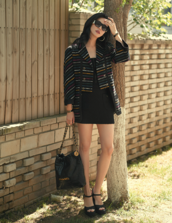 画面一转,姚晨又转向室外拍摄,只见她身穿格纹西装下搭超短裙,悠闲靠在一棵树前凹造型,戴着墨镜偏头望向一边。凉鞋与超短裙让姚晨的一双笔直长腿一览无余,双腿纤细又修长,可以说是“腿精”不足为过。
