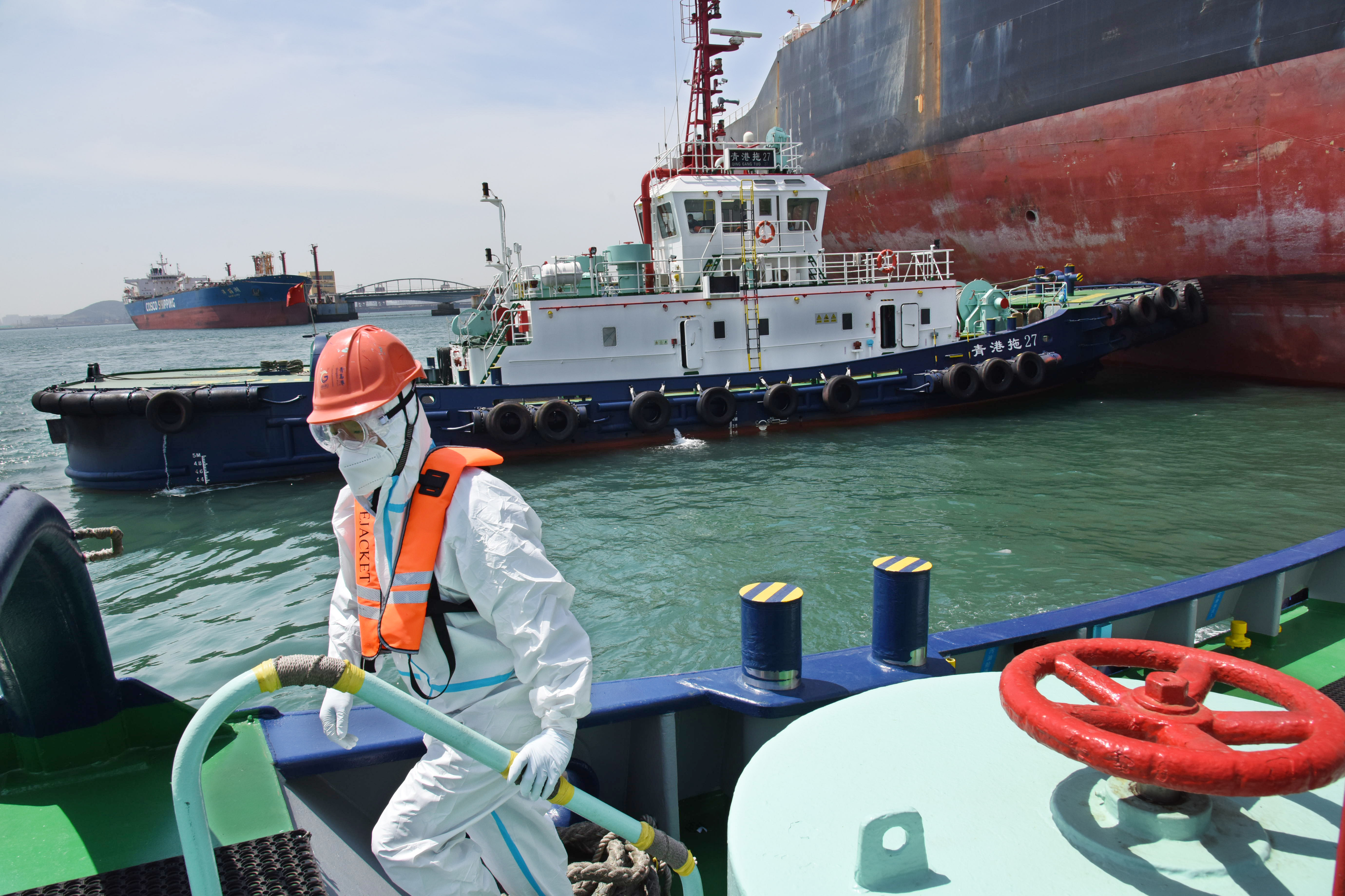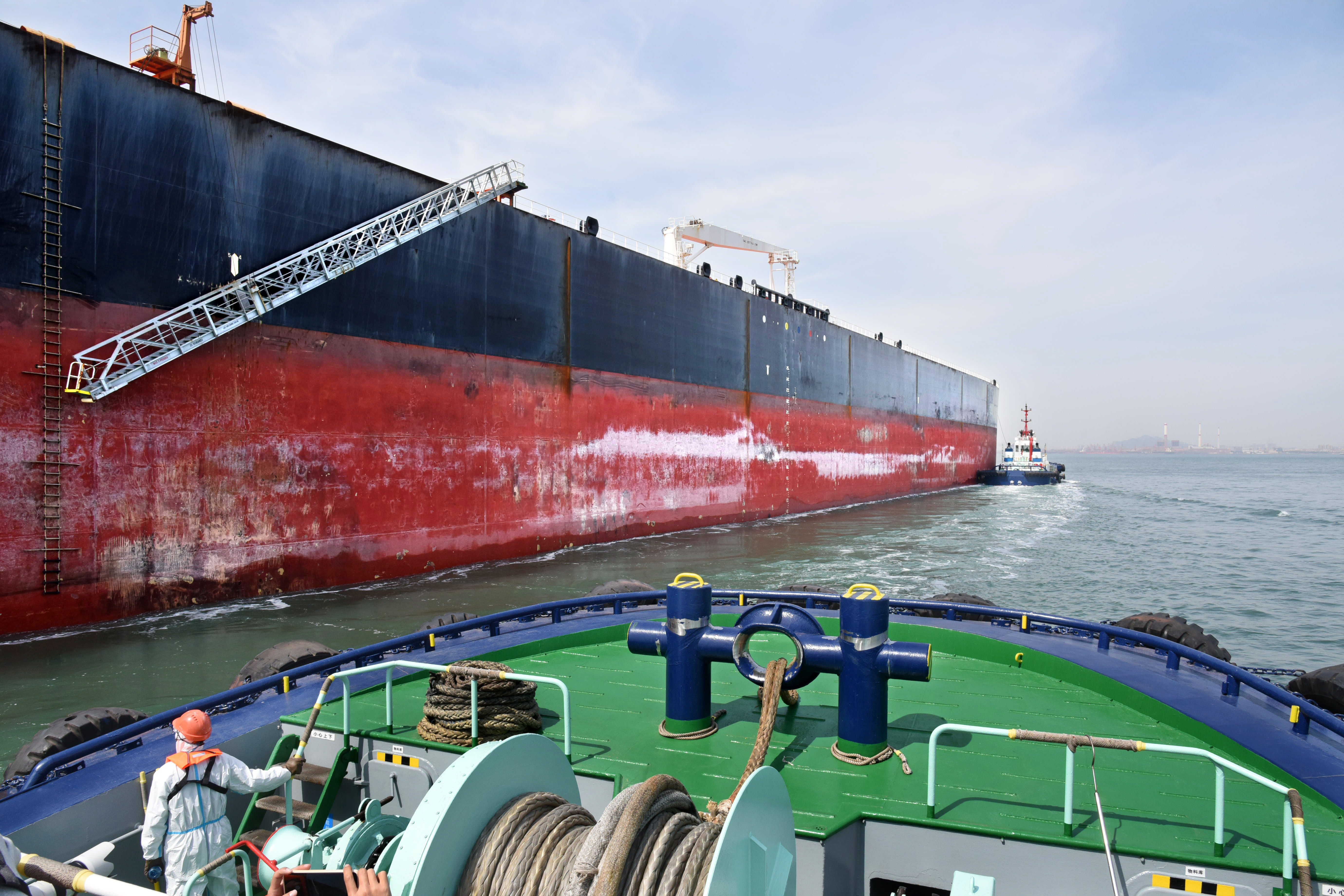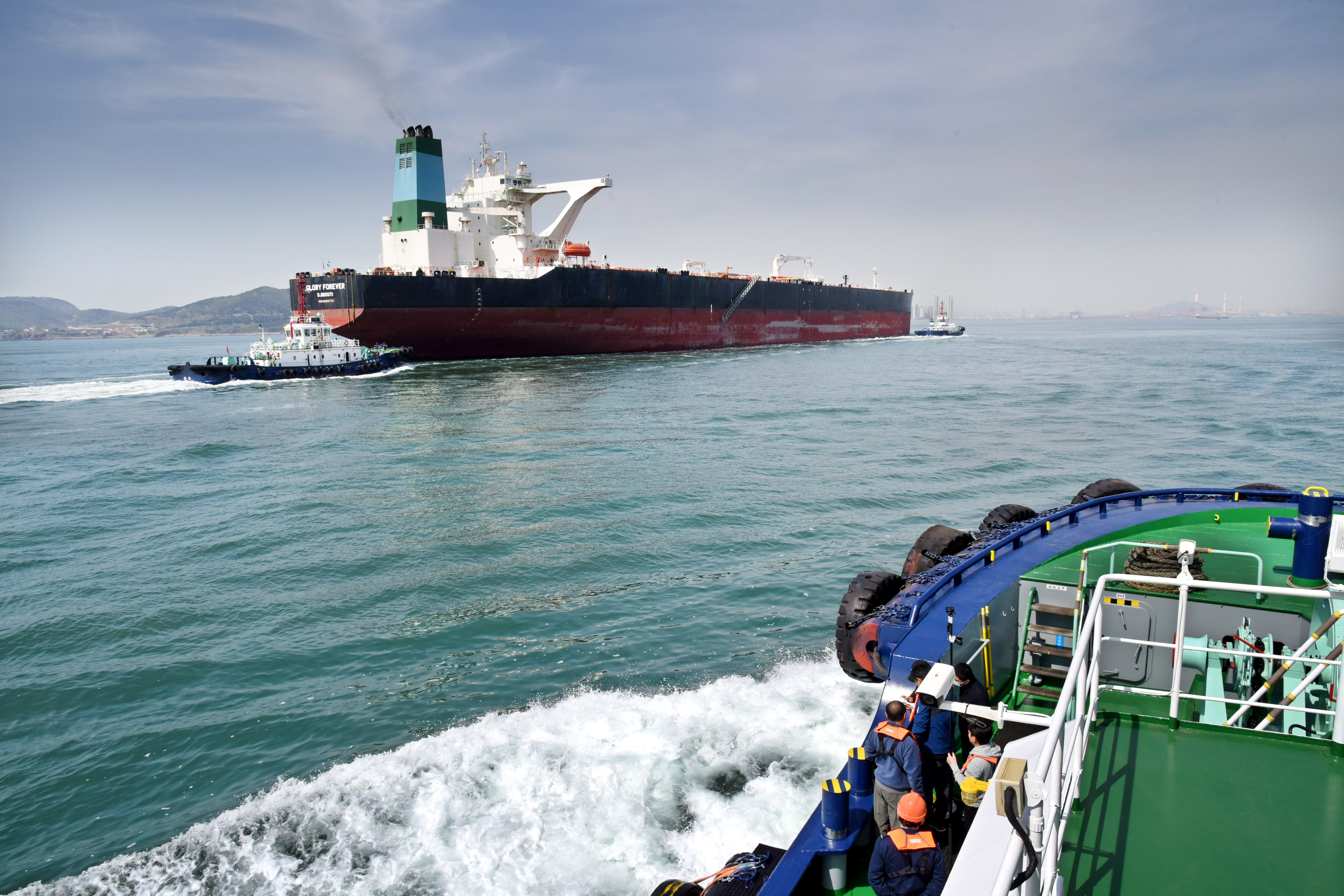 5月1日,“亚洲十号”拖轮跟随一艘油轮进港。新华社记者 李紫恒 摄