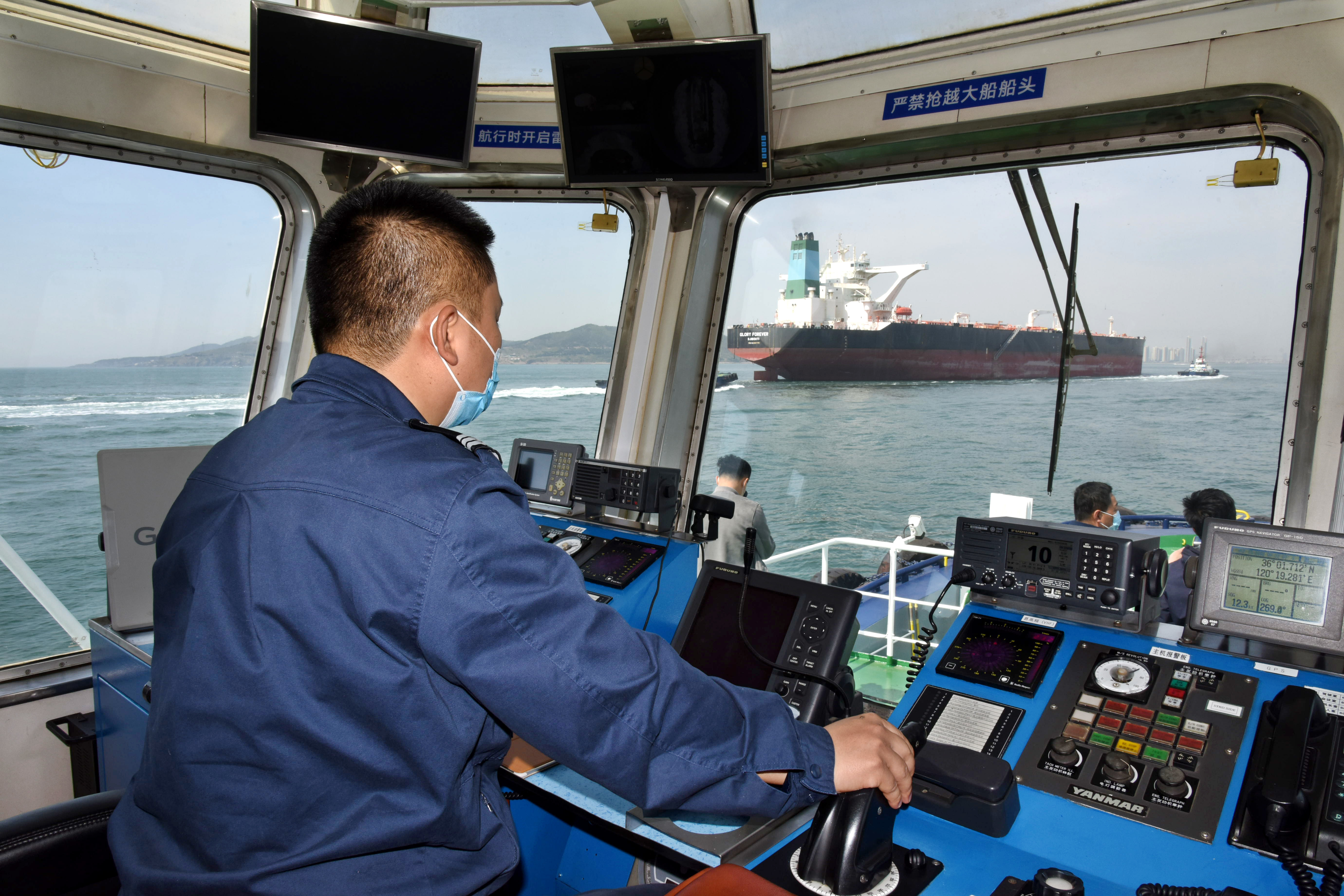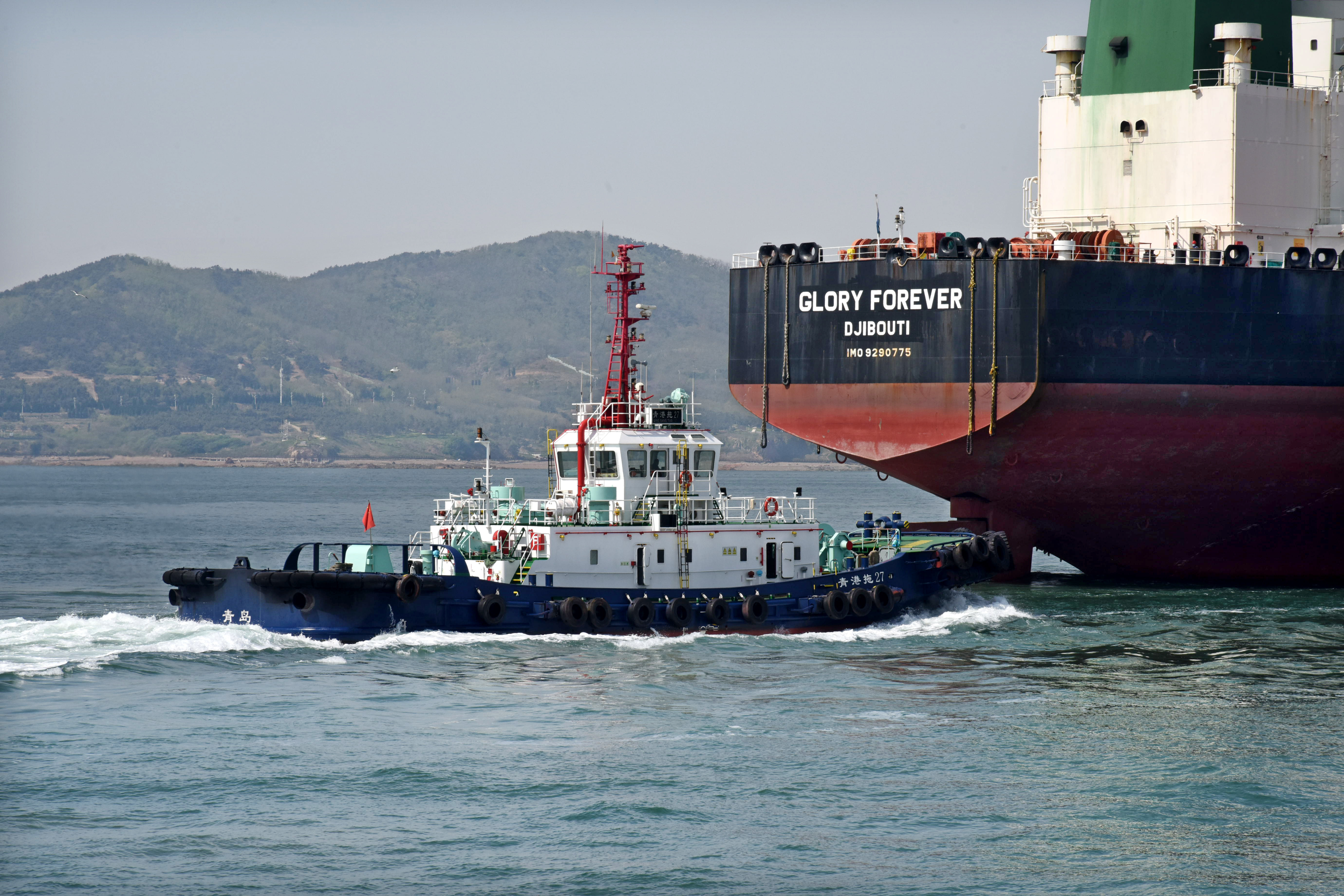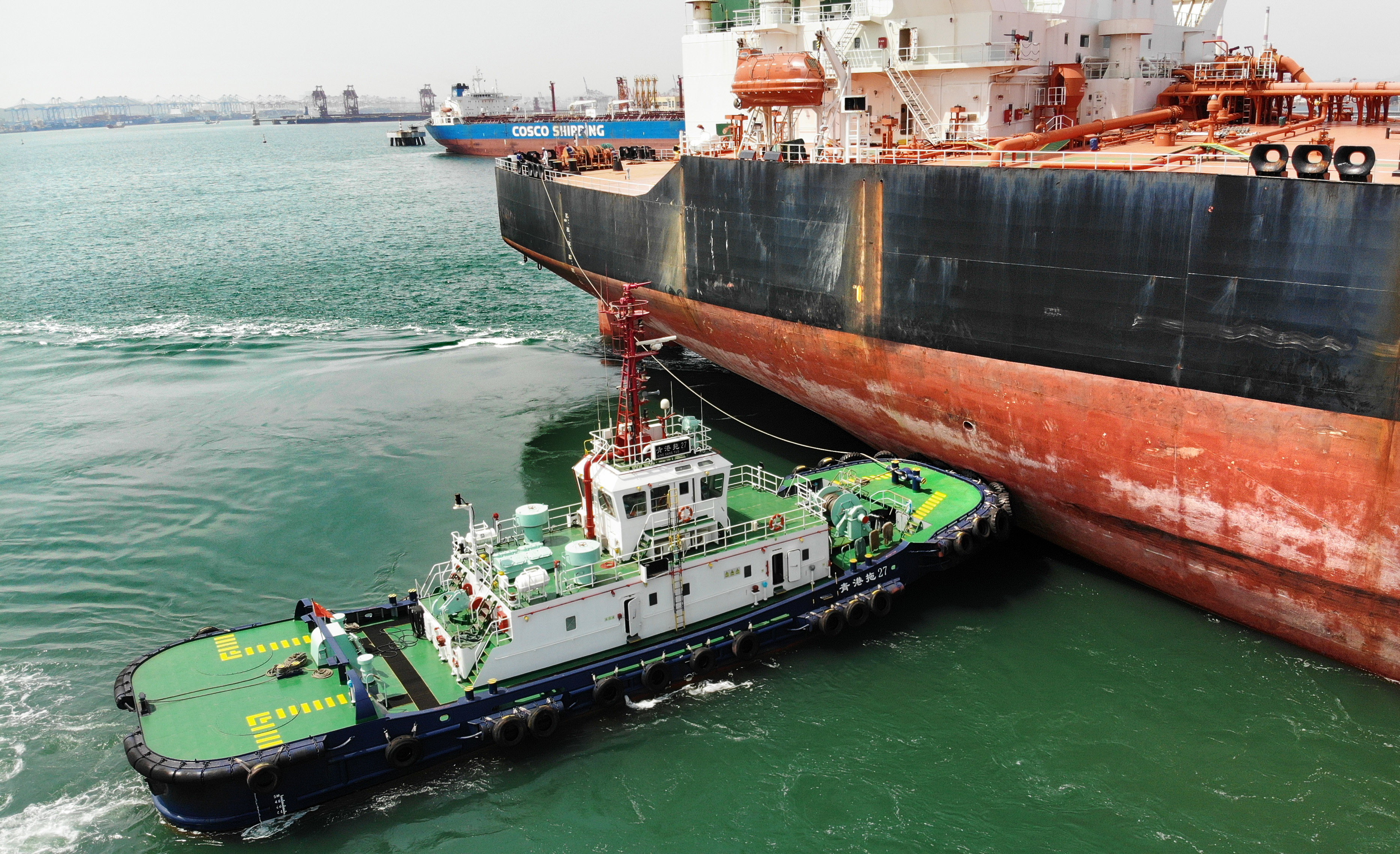 5月1日,“亚洲十号”拖轮跟随一艘油轮进港。新华社记者 李紫恒 摄