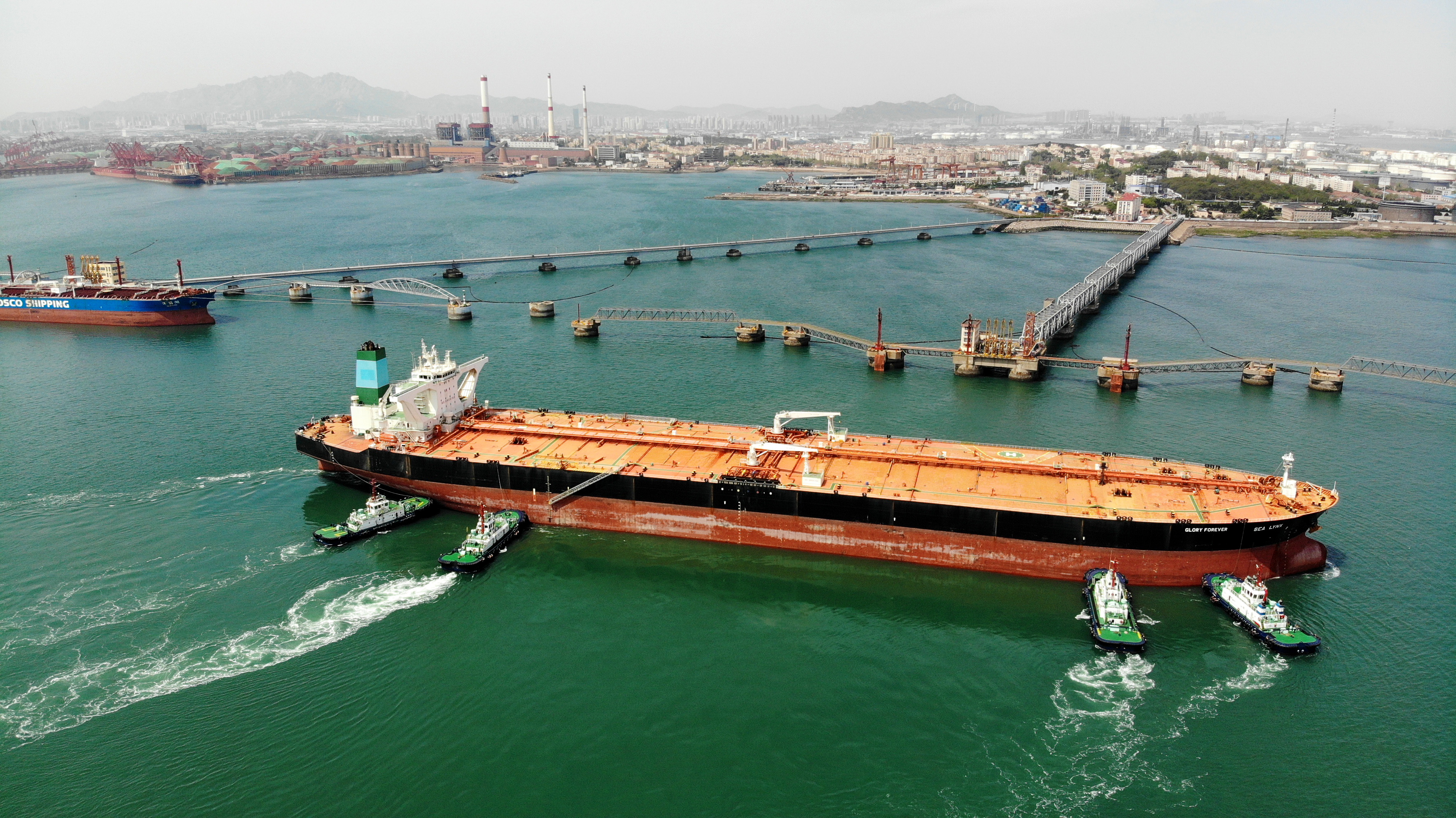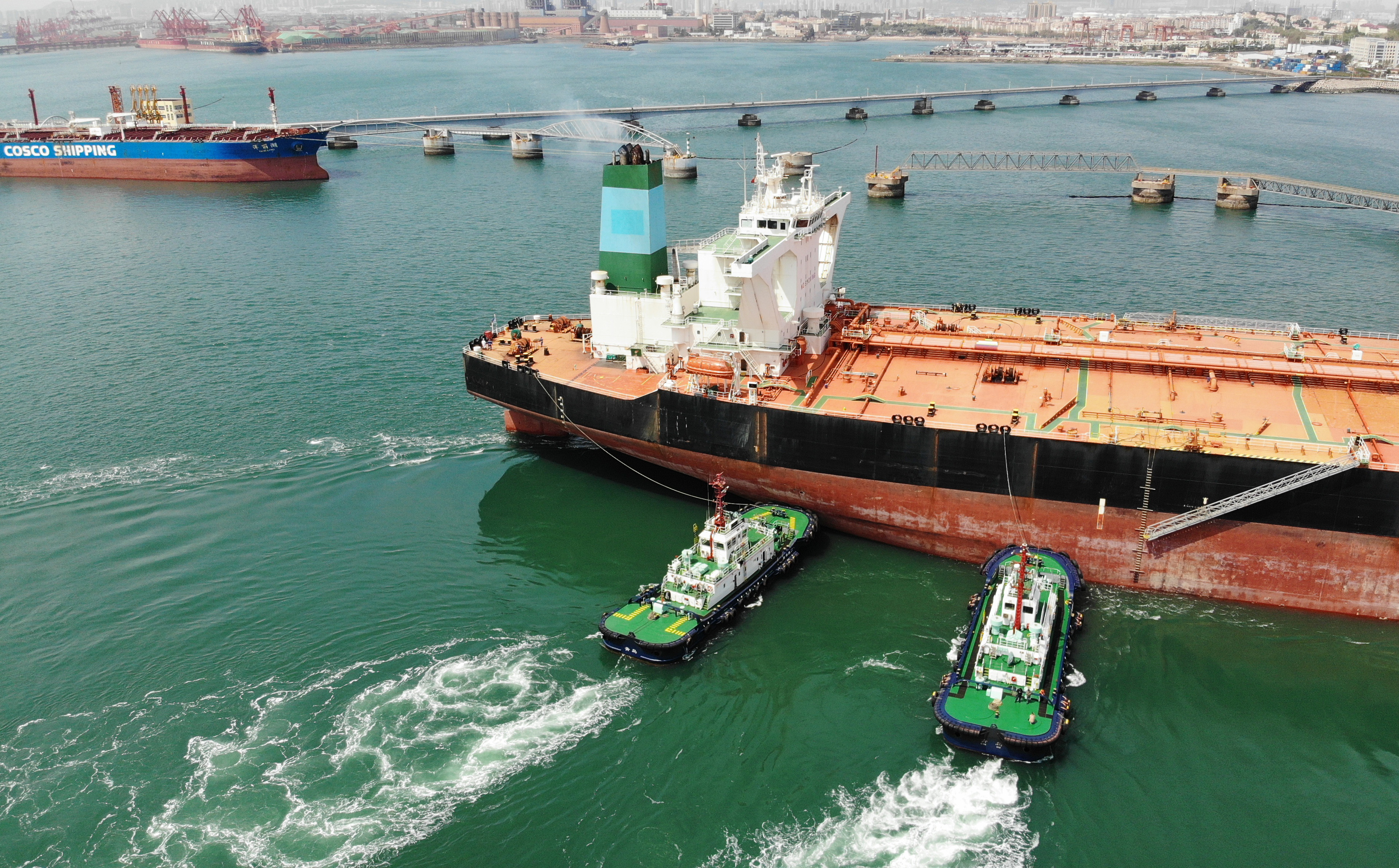 5月1日,在山东港口青岛港黄岛港区原油码头,拖轮协助油轮进港卸油。新华社记者 李紫恒 摄