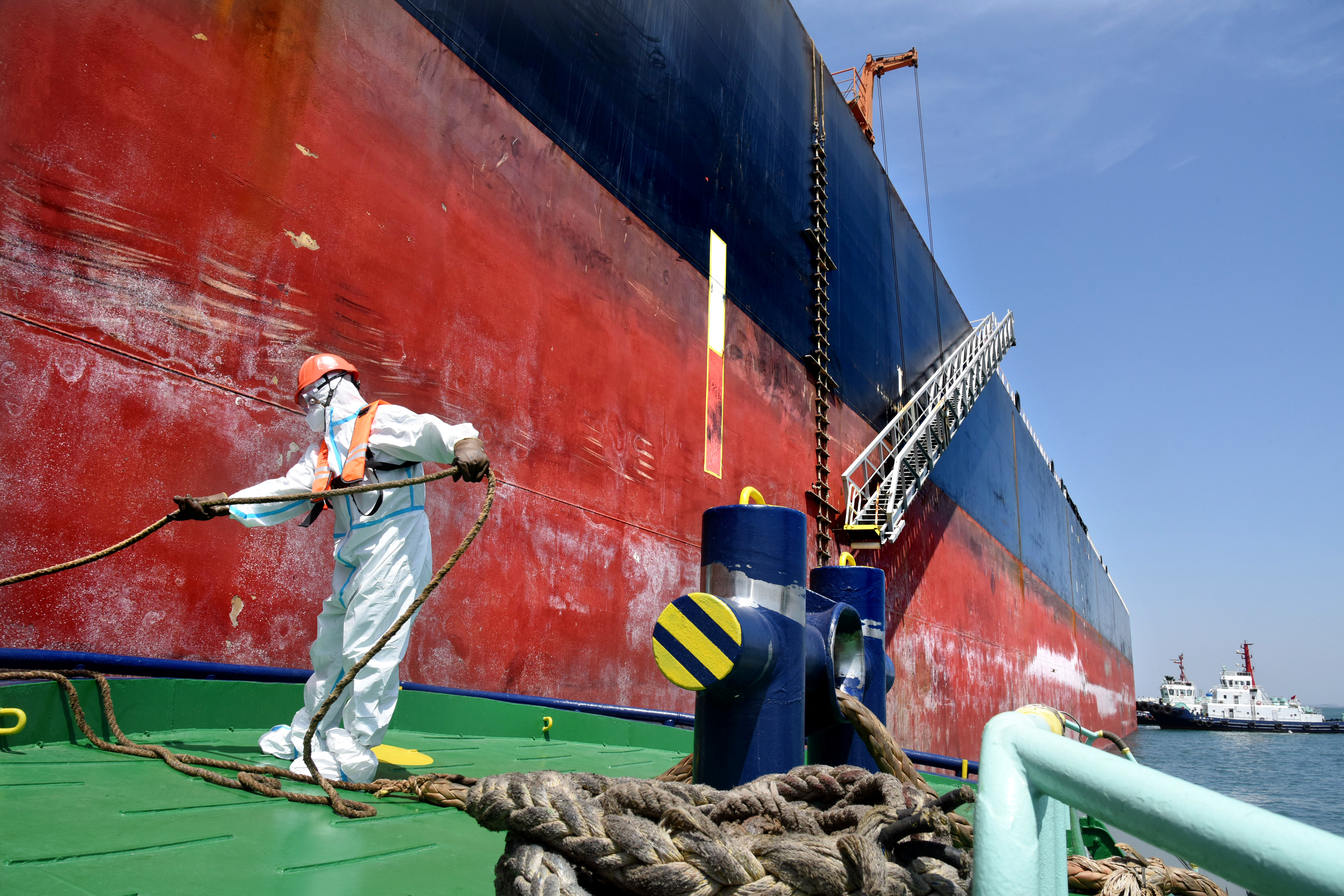 5月1日,拖轮船员在进行油轮接卸固缆作业。新华社记者 李紫恒 摄
