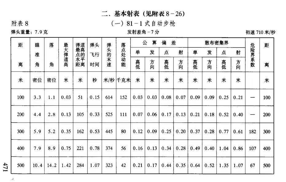 下面是95和81的射表,里面写的也是清清楚楚,95在500米的距离上,存速和存能比81高出的不是一星半点。而且,子弹的落差、落角,95又是比81强的不是一星半点,弹道性能上又比81高了一大截。95的直射距离有370米,81的直射距离只有280米。这个直接关系到步枪精度的问题,81和AK的7.62*39mm枪弹打的就是不准。