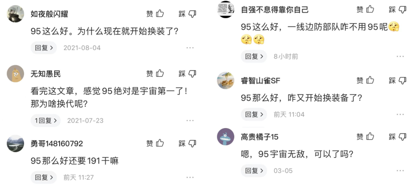 而在我这篇文章下,黑子们开始“95这么好为什么换装”、“95有你说的这么好为什么还换了191”........诸如此类的评论。对此,我曾经多次回看这篇文章,发现我通篇讲的都是95基线高低的问题,并没有讲95如何好。
