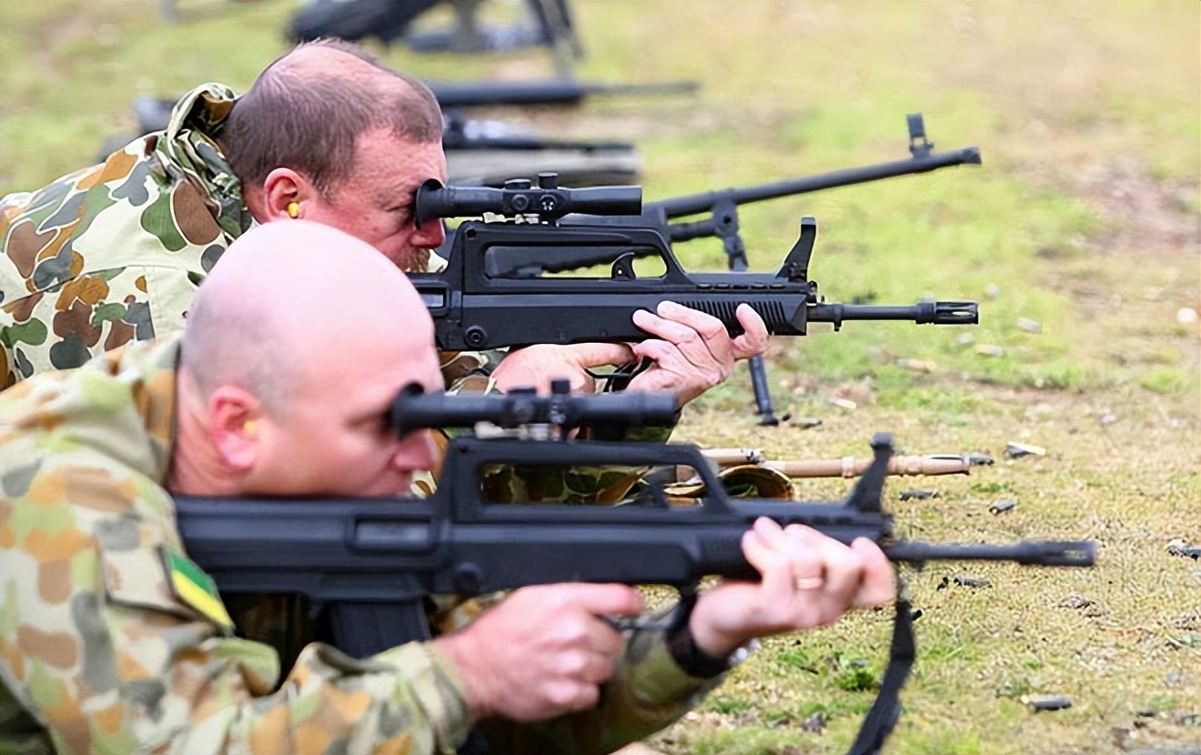 95的基线高,也是高在加了瞄具之后基线才高的。M16、M4后来为了加瞄具,都是将提把给撤掉了,这样才不高了。而使用机械瞄具的时候,95的瞄准基线并不高,黑子在这里,属于没黑到点上。这又是直托步枪的一个事实,瞄准基线降低、无法瞄准,而直托步枪,就是比斜托步枪精度高。