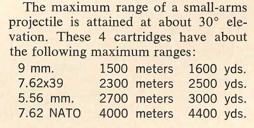 很多人觉得,口径大,就一定打的远,口径大杀伤力就大,很多人就觉得AK远射有优势、SKS远射有优势,实际情况恰恰相反,AK的7.62*39mm枪弹的弹道性能、最大射程、远距离存能,都不如小口径枪弹。下面这个是美军的一本小武器手册里列举的9*19mm手枪弹、7.62*39mm步枪弹、5.56mmNATO和7.62mmNATO的一个最大射程的一个对比,数据里明明白白的写着了,5.56mmNATO比7.62*39mm的最大射程多了400米。