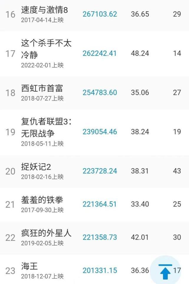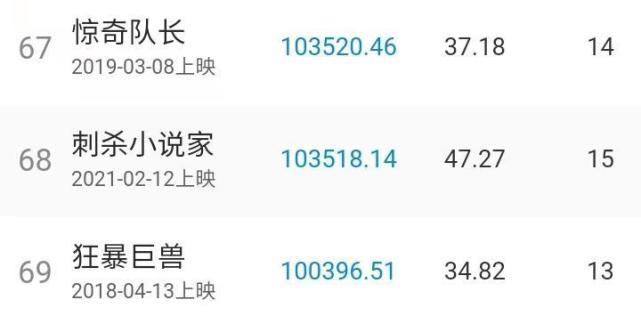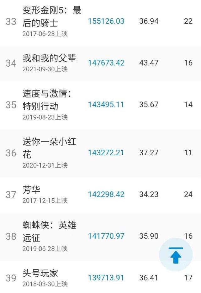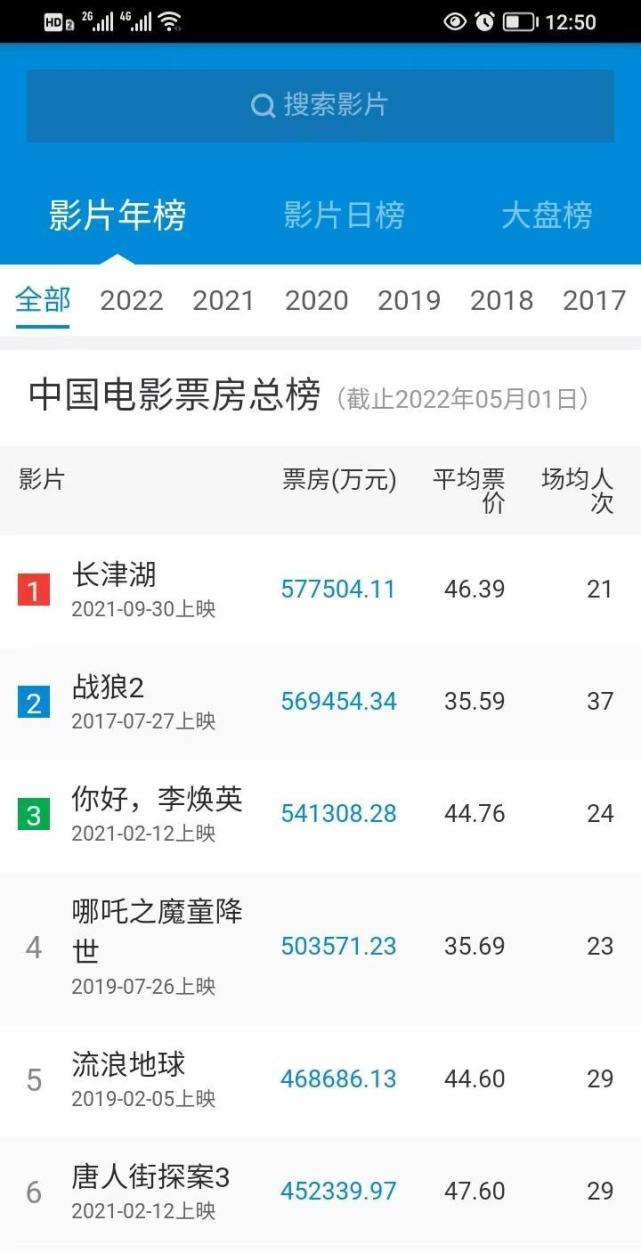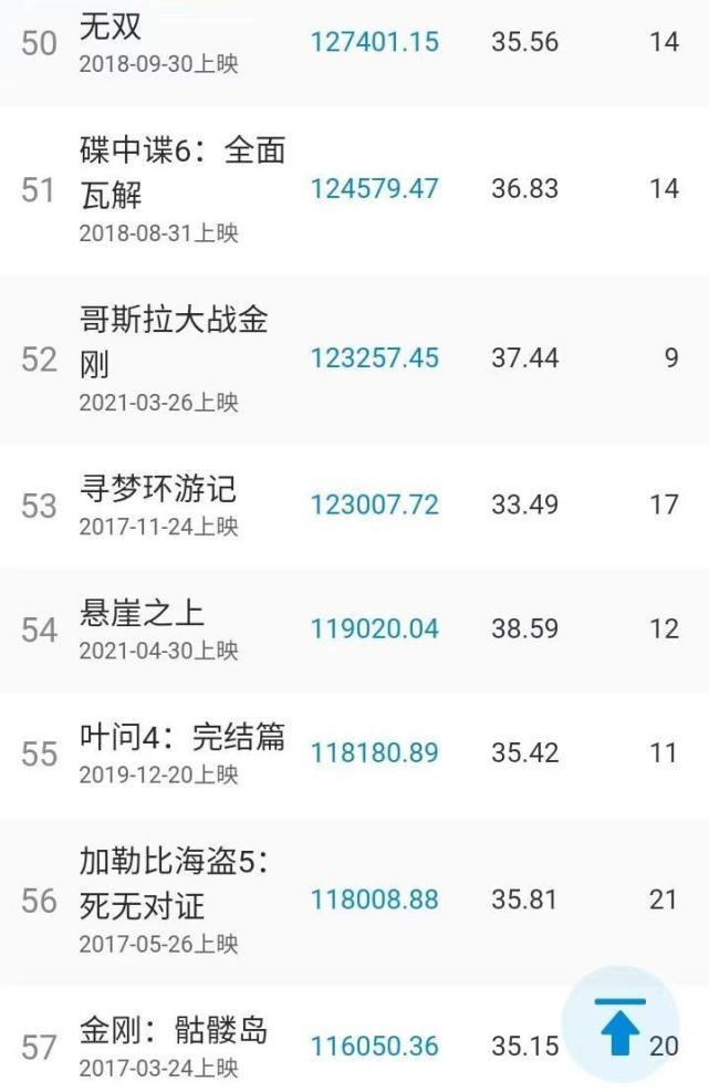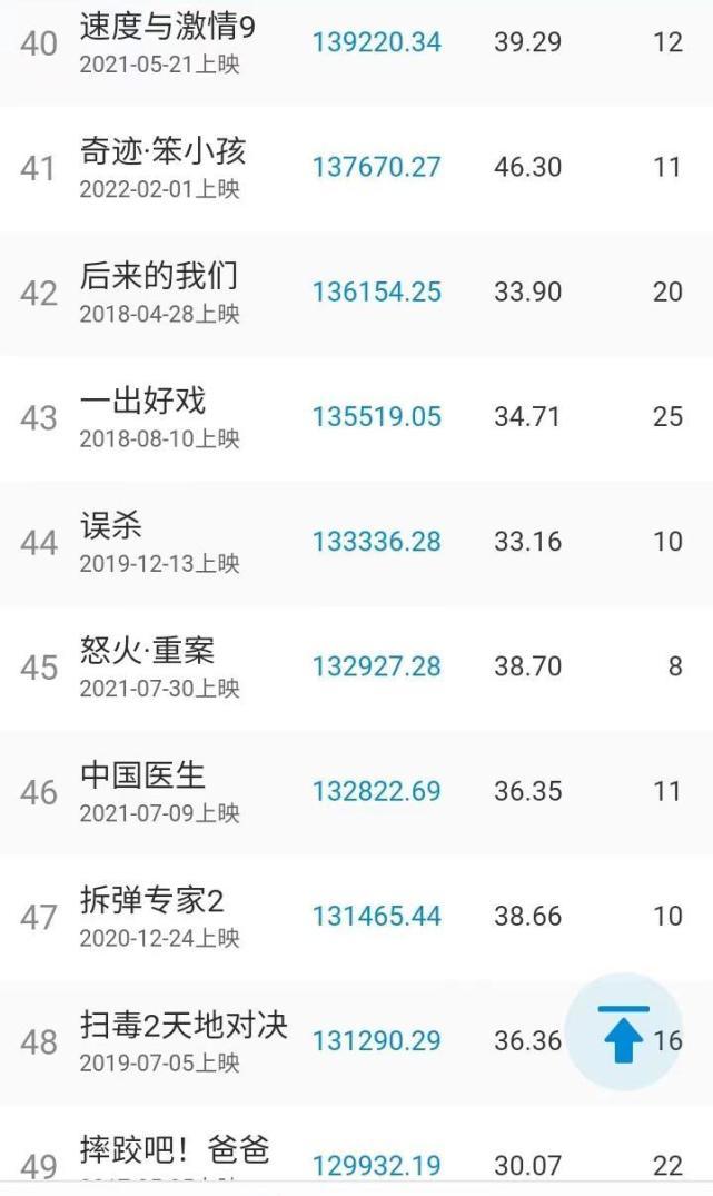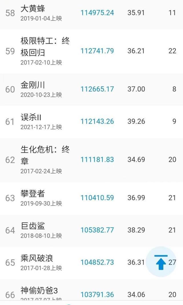 按此标准,根据《中国电影票房》数据发行,截止2022年5月1日,入榜为69部电影,为中国电影有史以来最多的!排前10的依次分别为: