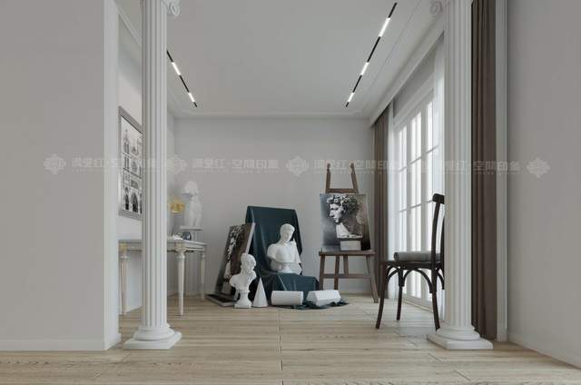 在拐角的空闲空间,我们装饰成一个极具文化气息的艺术角。肃穆纯净的罗马石柱一下子将空间挑高,纯白色的空间,能将艺术品的美感尽情地释放。这是一个具有浪漫气质的空间。
