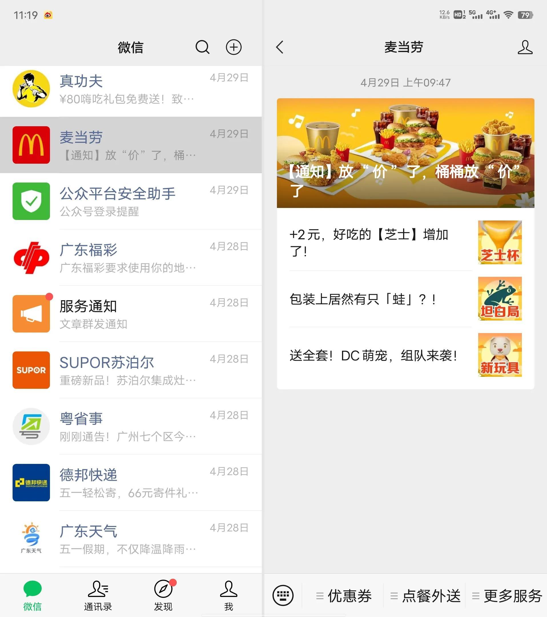 其次,是应用分身,当应用全屏显示时,打开第二显示层级时应用会自动左右分屏,比如说我们可以一边看左边不同的微信号,右边可以直接看到具体的消息,这样就可以不用担心跟某个人长时间的处于聊天状态时,错过了其他人的重要信息。