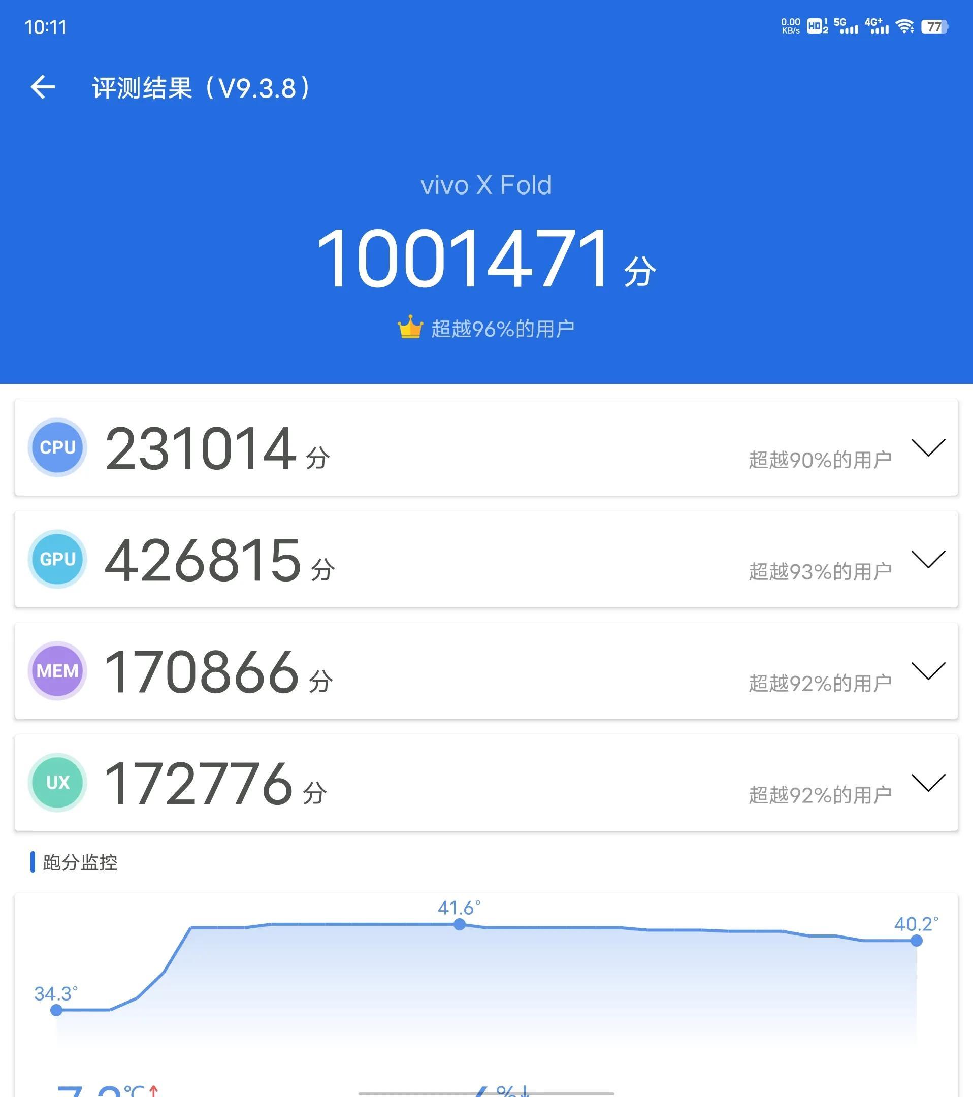 性能方面本来不是折叠屏的卖点,但vivo X Fold的性能也毫无疑问地达到了旗舰水准,甚至可以说表现超过了我的预期。搭载的是目前安卓最顶级的配置,骁龙8+增强版LPDDR5+超频版UFS3.1,安兔兔跑分也达到了100万分以上。