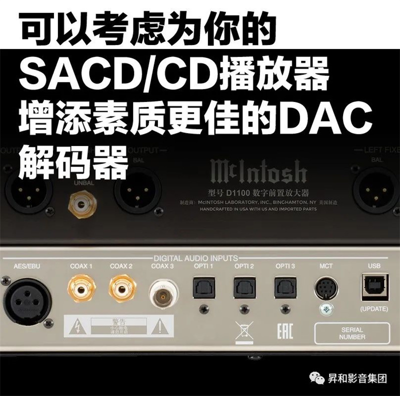 D1100的MCT端子为专门搭配自家的播放机而设计,配合MCT500转盘专有的MCT线连接,即可完美传输SACD的DSD讯号,从而达至最佳的播放效果。由于当年索尼与飞利浦在制定SACD规格时,不允许DSD讯号通过常规的同轴和光纤等接口进行数字传输,所以市面上SACD机多是由内置的解码器进行解码。少数Hi-End厂商获得索尼授权,可以利用特有的端子将SACD内的DSD讯号输出给DAC进行解码,McIntosh就是其中之一。所以,在麦景图的合并功放、前级的DAC模块与D1100上的MCT端子是无可替代的最佳方案。